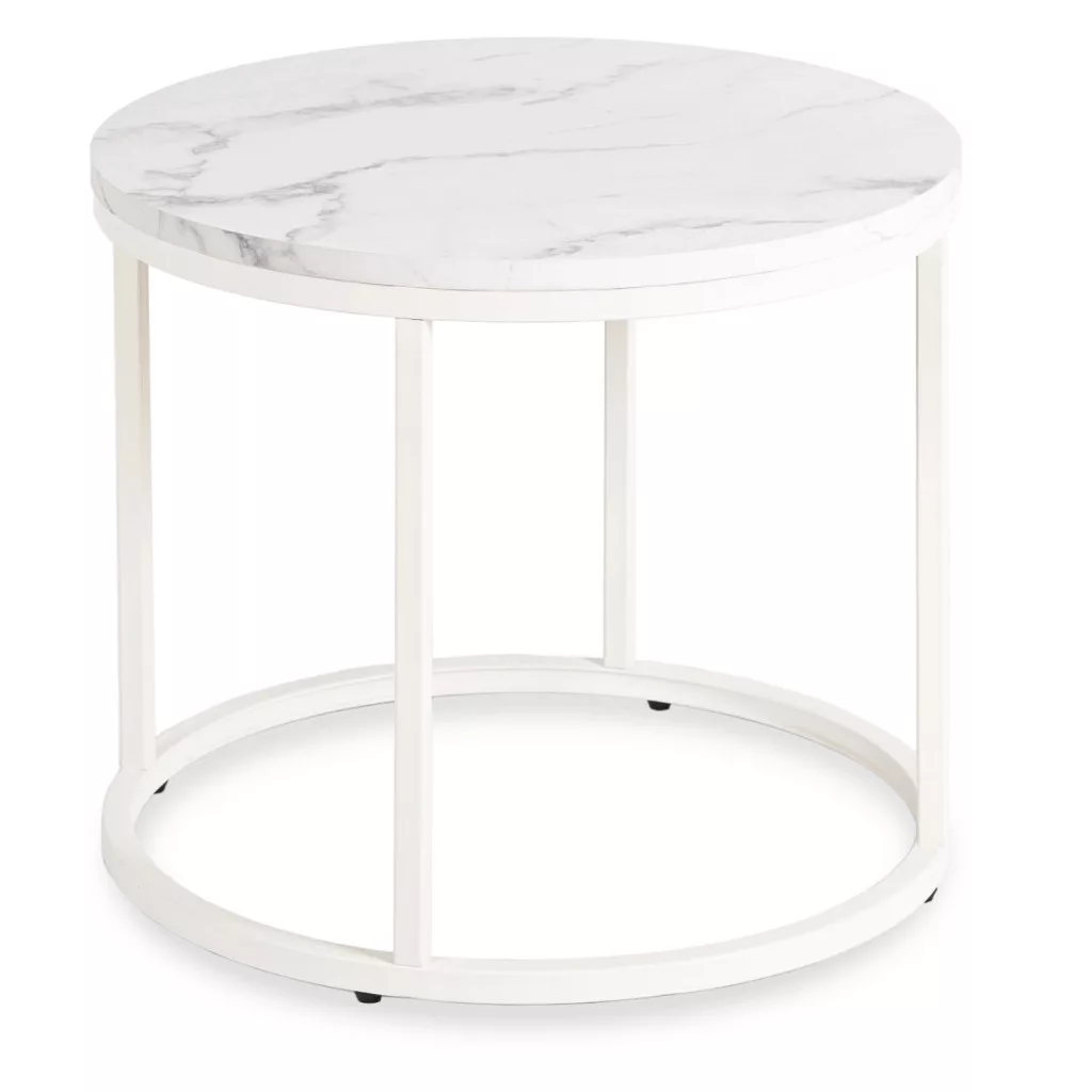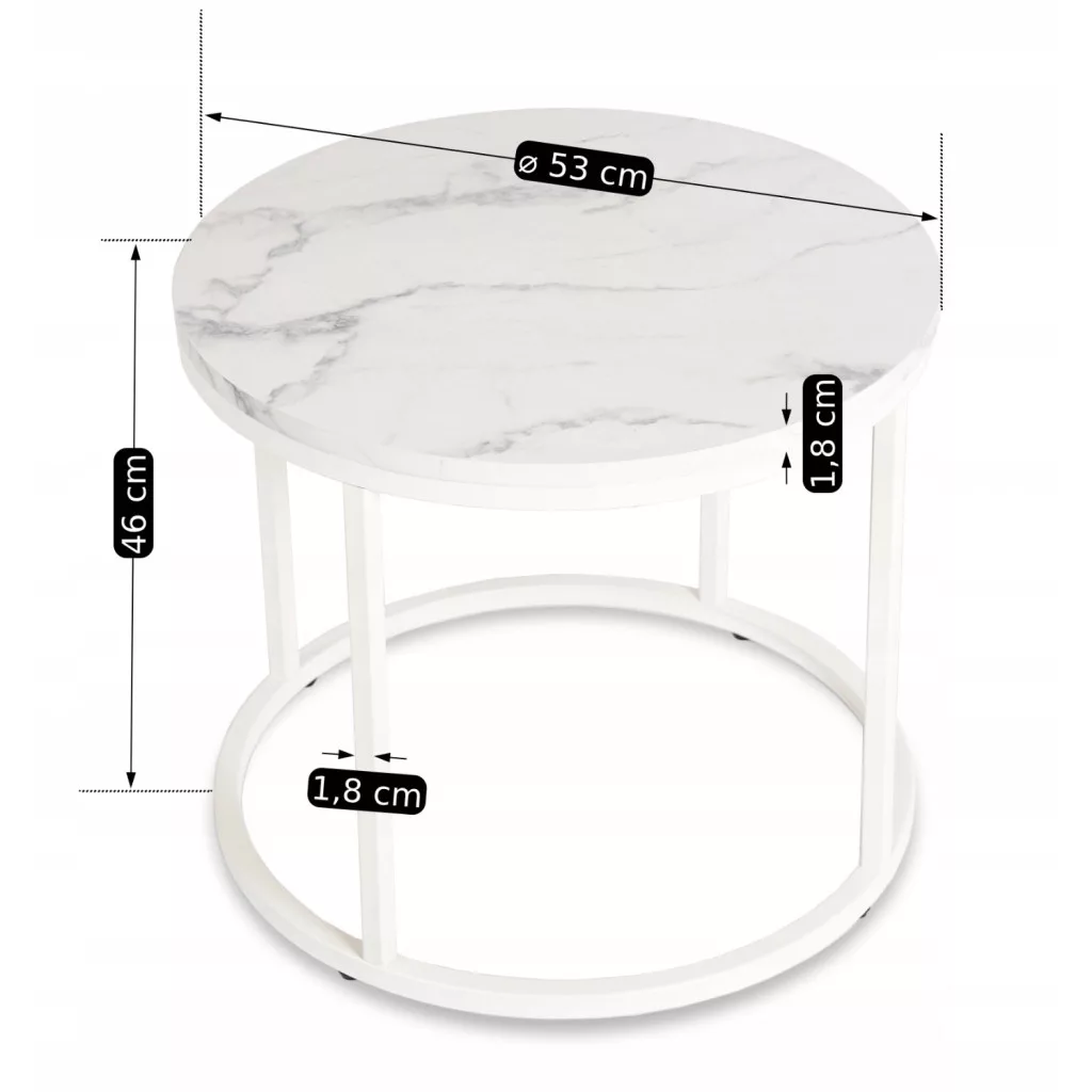 AGNES Kerek dohányzóasztal fehér márványból. Olyan bútordarabot keres, amely a modern dizájnt páratlan funkcionalitással ötvözi? Fedezze fel az Agnes dohányzóasztalt, amely eleganciát és frissességet kölcsönöz bármilyen belső térnek. Finom fehér márvány felülete tökéletes dekoratív kiegészítő, és egyben praktikus hely a reggeli kávéjához. Márvány tökéletesség otthonában. Tartósság és masszívság: Az 1,8 cm vastag asztallap a legmagasabb minőségű MDF-ből készült, fehér márvány bevonattal, luxus hangulatot kölcsönözve otthonának. Karcálló: Az asztal felületét védő laminált anyag tartós védelmet nyújt a mindennapi sérülésekkel szemben.