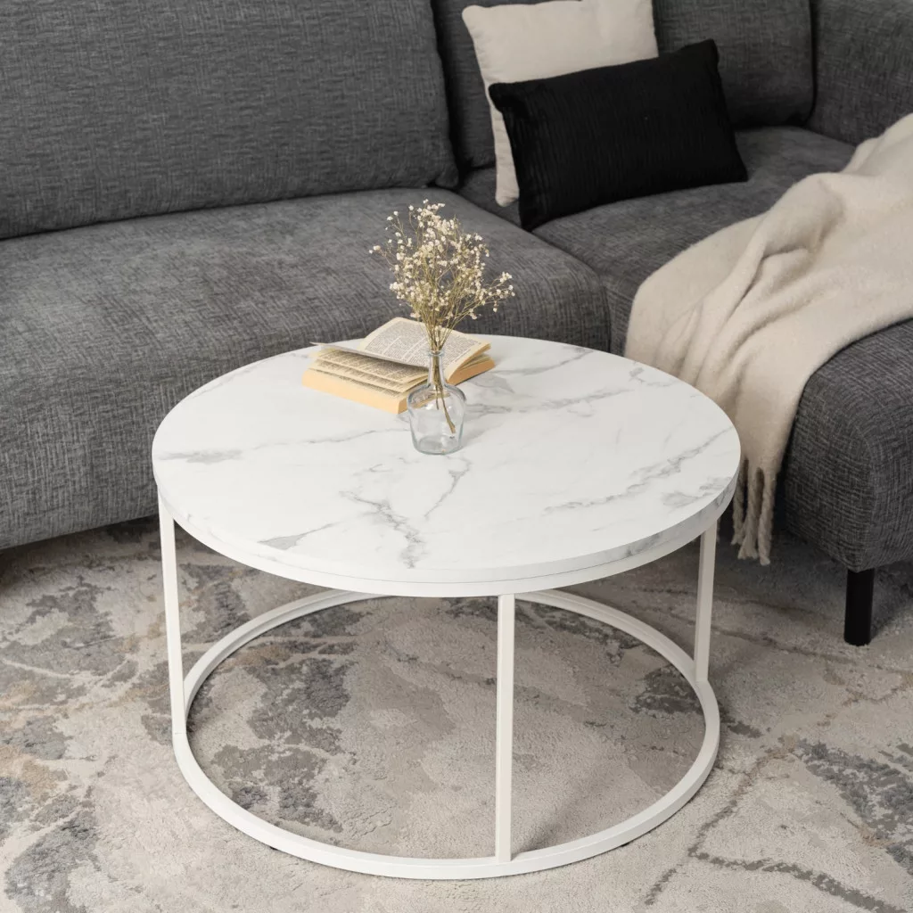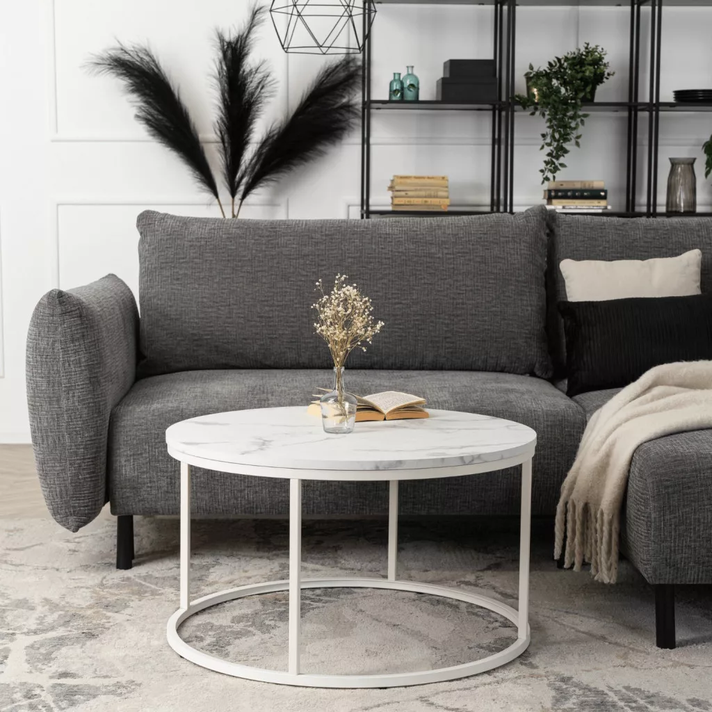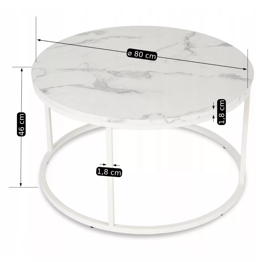 AGNES MAX Kerek Dohányzóasztal Fehér Márványból. Olyan bútordarabot keres, amely felfrissíti otthonát és eleganciát kölcsönöz neki? Az Agnes Max fehér márvány dohányzóasztal a tökéletes választás. A modern dizájnt és a praktikumot ötvözi, így nemcsak funkcionális bútordarab, hanem egyedi dekoráció is bármely helyiségbe. A fehér márvány eleganciája. Kivételes tartósság: Az asztallap 1,8 cm vastag MDF lapból készült, fehér márvány laminátummal borítva, amely friss és elegáns megjelenést kölcsönöz az enteriőrnek. Ellenálló a mindennapi kihívásokkal szemben: A laminált bevonat megvédi az asztallapot a karcolásoktól és horpadásoktól, így az asztal ideális a mindennapi használatra.