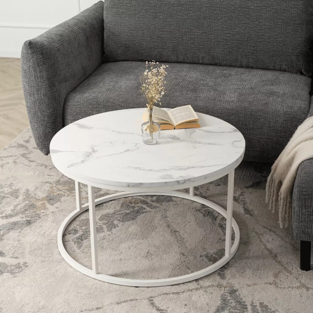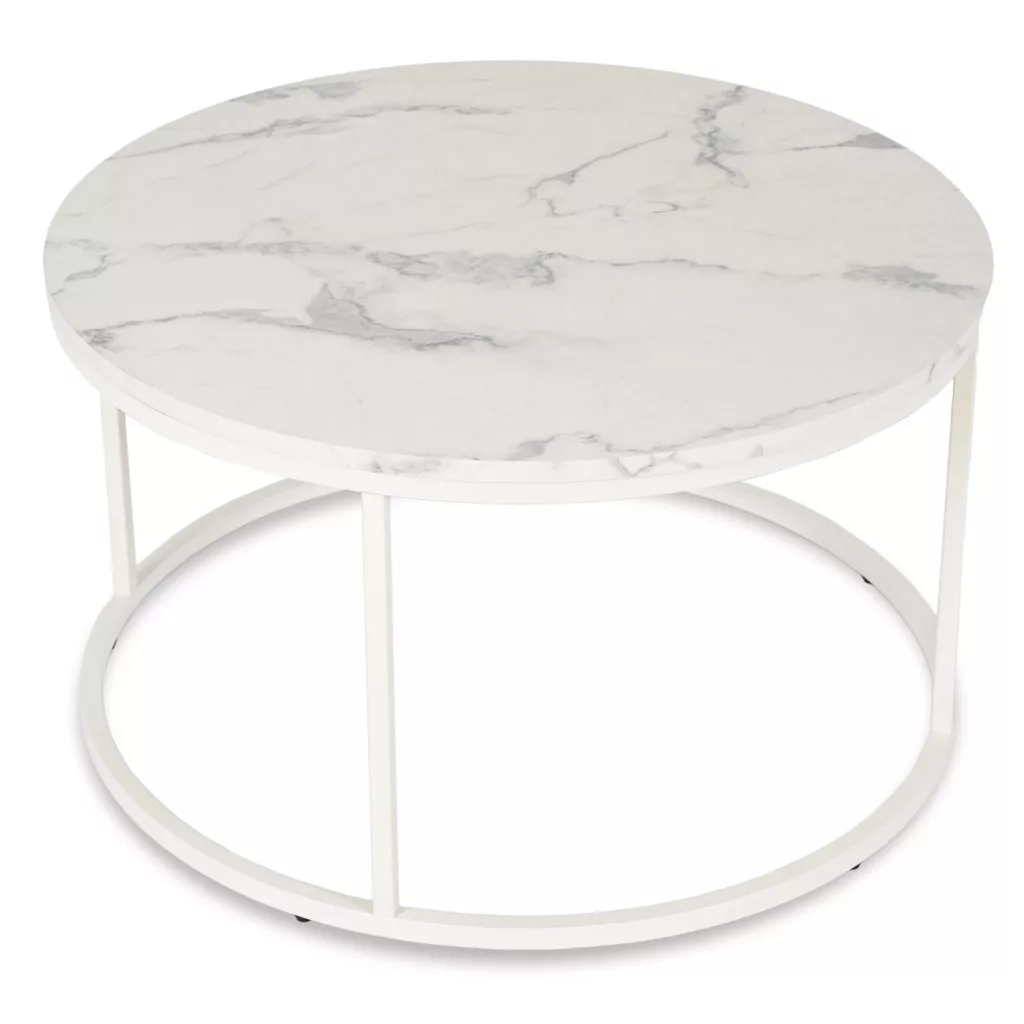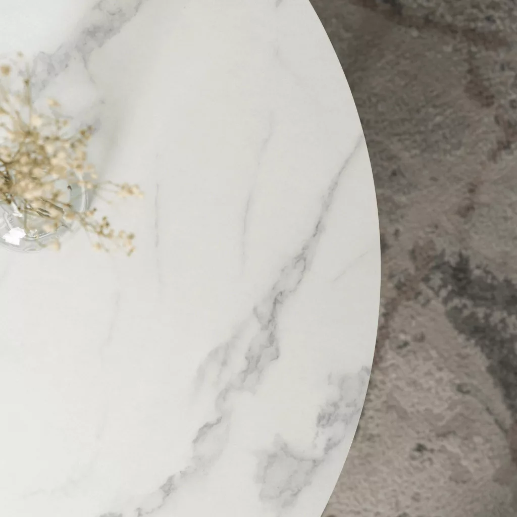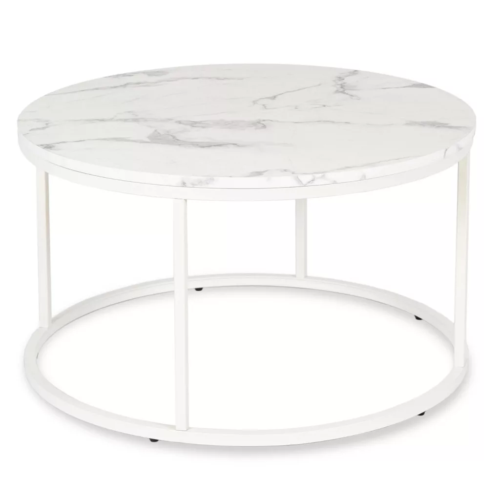 AGNES MAX Kerek Dohányzóasztal Fehér Márványból. Olyan bútordarabot keres, amely felfrissíti otthonát és eleganciát kölcsönöz neki? Az Agnes Max fehér márvány dohányzóasztal a tökéletes választás. A modern dizájnt és a praktikumot ötvözi, így nemcsak funkcionális bútordarab, hanem egyedi dekoráció is bármely helyiségbe. A fehér márvány eleganciája. Kivételes tartósság: Az asztallap 1,8 cm vastag MDF lapból készült, fehér márvány laminátummal borítva, amely friss és elegáns megjelenést kölcsönöz az enteriőrnek. Ellenálló a mindennapi kihívásokkal szemben: A laminált bevonat megvédi az asztallapot a karcolásoktól és horpadásoktól, így az asztal ideális a mindennapi használatra.