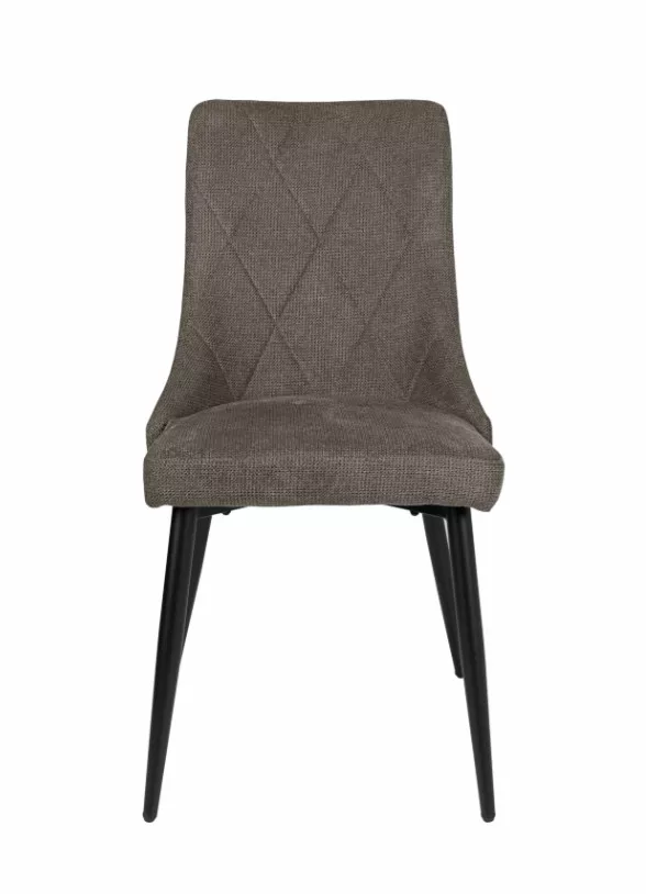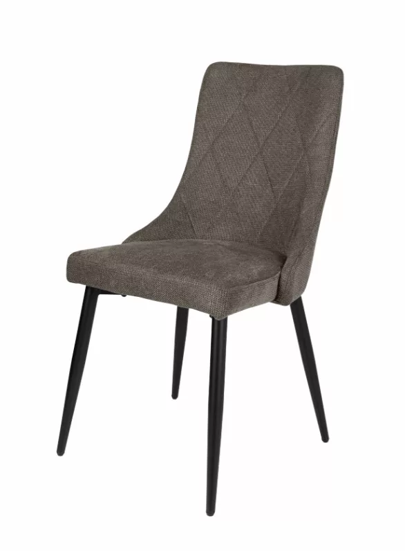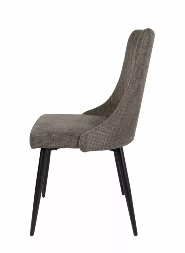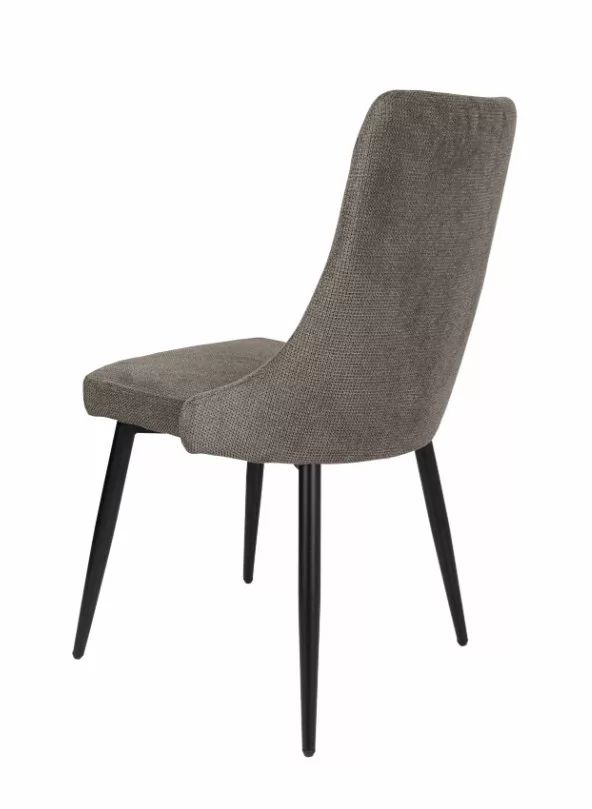 Modern étkezőszék, enyhén ívelt háttámlával, puha tapintású szövet kárpittal, fekete porfestett fém lábakkal. Beige, barna és szürke színben érhető el.