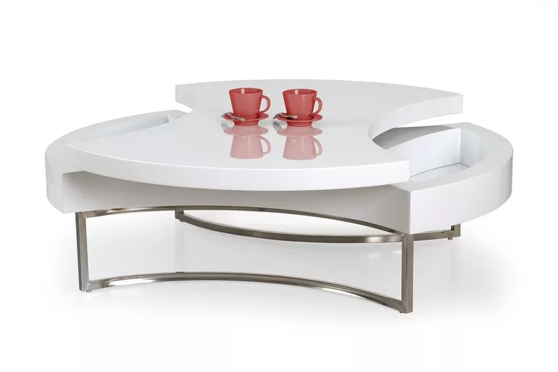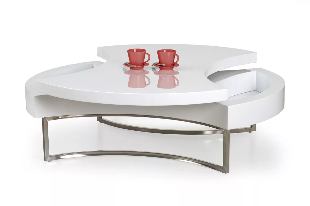Magasfényű, lakkozott MDF asztallap, krómozott acél vázzal.