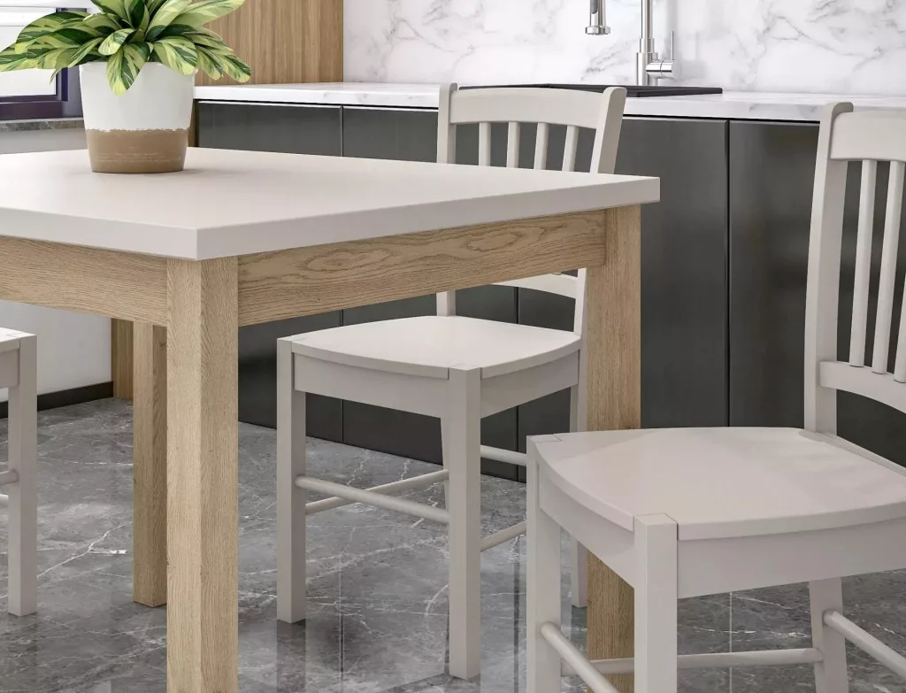 Fedezd fel a Stół Adam 90 étkezőasztalt, amely tökéletes kiegészítője lehet modern otthonodnak! Laminált lapból készült, MDF vázzal van ellátva, elegáns kasmír illetve tölgy cremona torro színben elérhető el. Ideális választás a nappaliba vagy a konyhával, ahol stílusos megjelenés és funccionalitással mindenki gyakorlatilag magára vonja.
