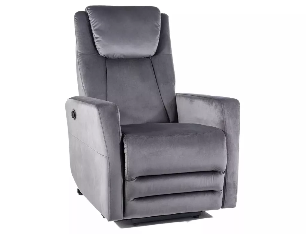 Elektromos dönthető fotel, állítható fejtámlával, Bluvel 14 bársony szövettel, szín: szürke. Vezetékes távirányító a fotel döntéséhez, zseb és USB töltőcsatlakozó a jobb oldalon.