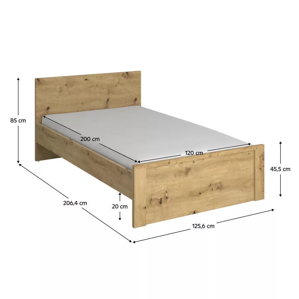 Anyag: laminált DTD/ABS élek Szín: artisan tölgy Méretek (SzxMéxMa): 125,6x206,4x85 cm Anyag vastagsága: 1,6-3,2 cm Alvófelület méretei (SzxHo): 120x200 cm Alvófelület magassága: 45,5 cm Matrac ajánlott magassága: 14,5 cm Az alsó tér magassága a padlótól: 20 cm Teherbírás/ személy: 100 kg Matrac és ágyrács nélkül szállítva Ágyrács és matrac vásárolható a kínálatunkból Műanyag lábak Modern dizájn Szétszerelve szállítva