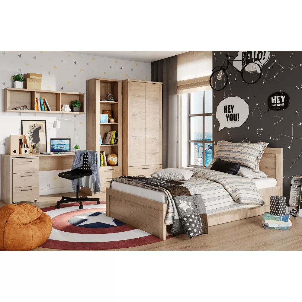 "Ágy DORSI 120 Anyag: laminált DTD/MDF Szín: navarra tölgy Méretek (SzxMéxMa): 127,3x206,9x89,5 cm Alvófelület (SzxHo): 120x200 cm Anyag vastagsága: 1,6 cm Az alsó tér magassága a padlótól: 14,5 cm Matrac ajánlott magassága: min 4 cm Oldalfal magassága: 37,4 cm Teherbírás/ fekvőhely: 100 kg Tárhely nélkül Matrac és ágyrács nélkül szállítva Ágyrács és matrac hozzávásárolható a kínálatunkból Modern dizájn