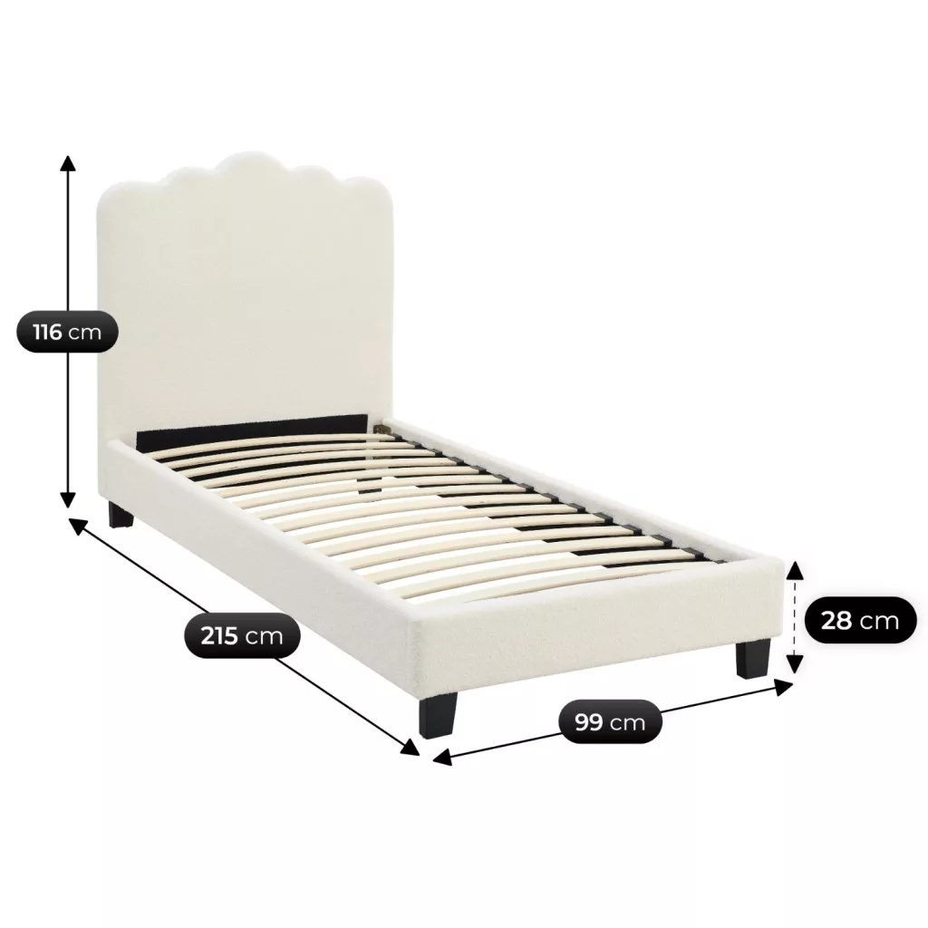 CRATER 90 x 200 krémszínű kárpitozott ágy. Stílusos, kényelmes ágyat keresel – ami tökéletesen illik egy modern tinédzser szobájába? A Crater ágy a tökéletes választás. Ez egy olyan bútordarab, amely melegséggel ölel körül, és a hétköznapi estéket a béke és a jólét pillanataivá varázsolja. Mi teszi különlegessé a Crater ágyat? A mackószerű kárpitanyag puha, kellemes tapintású, és divatos külsőt kölcsönöz a szobának. A magas, kárpitozott fejtámla kényelmes támaszt nyújt tanulás és pihenés közben. A tömör fa lábak garantálják a szerkezeti stabilitást. A rugalmas léces váz egészséges, pihentető alvást biztosít, és tartósságot biztosít. A 90 x 200 cm-es hálórész ideális egy személy számára, tökéletes egy tinédzser szobájába. A maximális teherbírás 250 kg – mindennapi használatra alkalmas. A Crater ágy tökéletesen kiegészíti a világos, pasztellszínű dekorációt és a modern ifjúsági enteriőröket. Melegséget visz a szobába, tökéletes helyet teremtve a kikapcsolódásra. Fedezd fel a kényelem új dimenzióját – válaszd a Crater ágyat. Megjegyzés: A matrac nem tartozék.