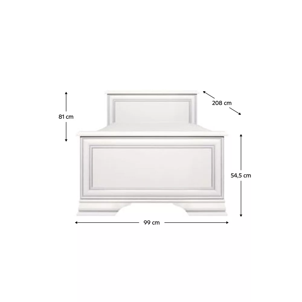 Anyag: laminált DTD Szín: alpesi fehér Méretek (SzxMéxMa): 99x208x81 cm Alvófelület (SzxHo): 90x200 cm Oldalfal magassága: 22 cm Egyszemélyes Anyag vastagsága: 1,6 cm Lábakon Lábak magassága: 8 cm Rács nélkül szállítva Ajánljuk, hogy vásárolja meg hozzá a KENTAK önálló ágyrácsot Matrac nélkül szállítva Matrac megvásárolható a kínálatunkból Matrac ajánlott magassága: 16 cm Teherbírás/személy: 100 kg Szétszerelve szállítva