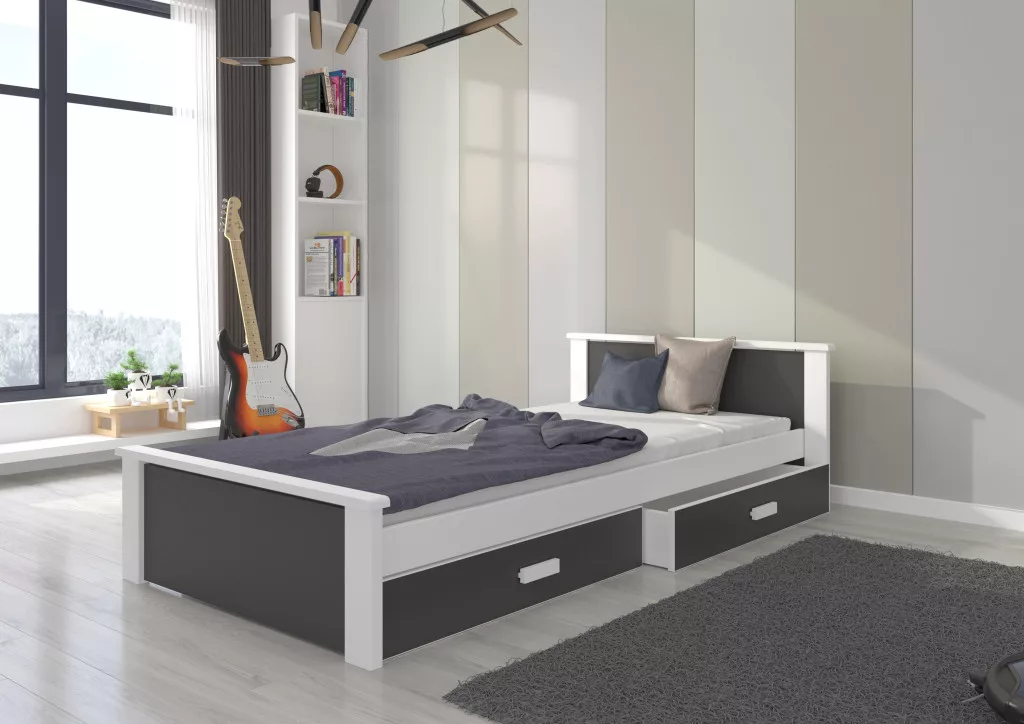 Egy egyszemélyes ALDEX ágy egyszerű formája remekül illeszkedik egy tinédzser szobájának belső terébe. Az ágy előnyei közé tartoznak két nagy, funkcionális ágyneműtartó fiók, melyek görgőkkel vannak felszerelve. A szett tartalmazza a strapabíró, merev lécű ágyrácsot is. Az ágykeret három rétegű lakkbevonattal van ellátva, ami biztosítja a mechanikai sérülések és különböző foltok elleni védelmet. Matrac nem tartozik az ágyhoz. Emellett ajánljuk figyelmébe az ALDEX SHELF modellt is, mely egy polccal van felszerelve, ideális helyet biztosítva éjjeli lámpának vagy kedvenc könyvének.