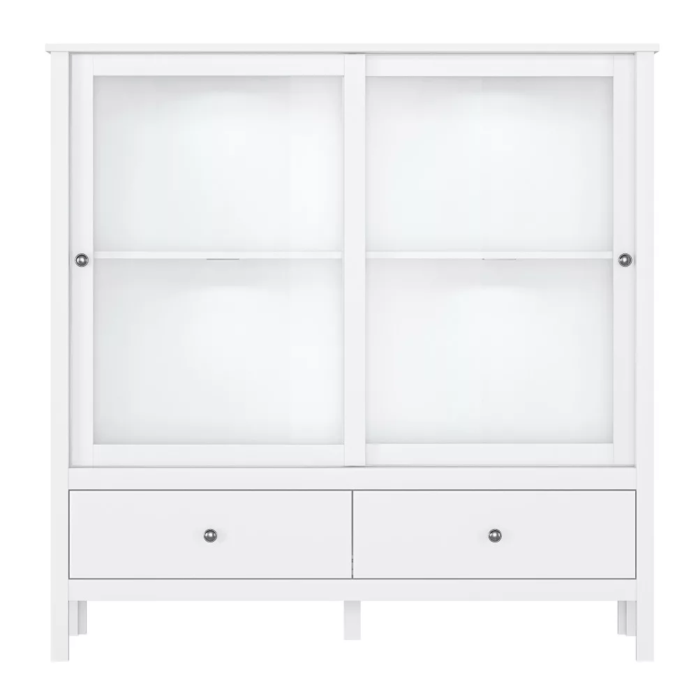 "Anyag: laminált DTD/ABS élek/MDF/üveg Szín: fehér Méretek (SzxMéxMa): 133x37x134 cm Lábak magassága: 16 cm Anyag vastagsága: 1,6 cm Kombinált vitrin Kétajtós Üveges ajtókat és két fiókot tartalmaz Fiók magassága: 18,9 cm A szekrényben polcok vannak LED világítás nélkül LED világítás hozzávásárolható Szétszerelve szállítva "