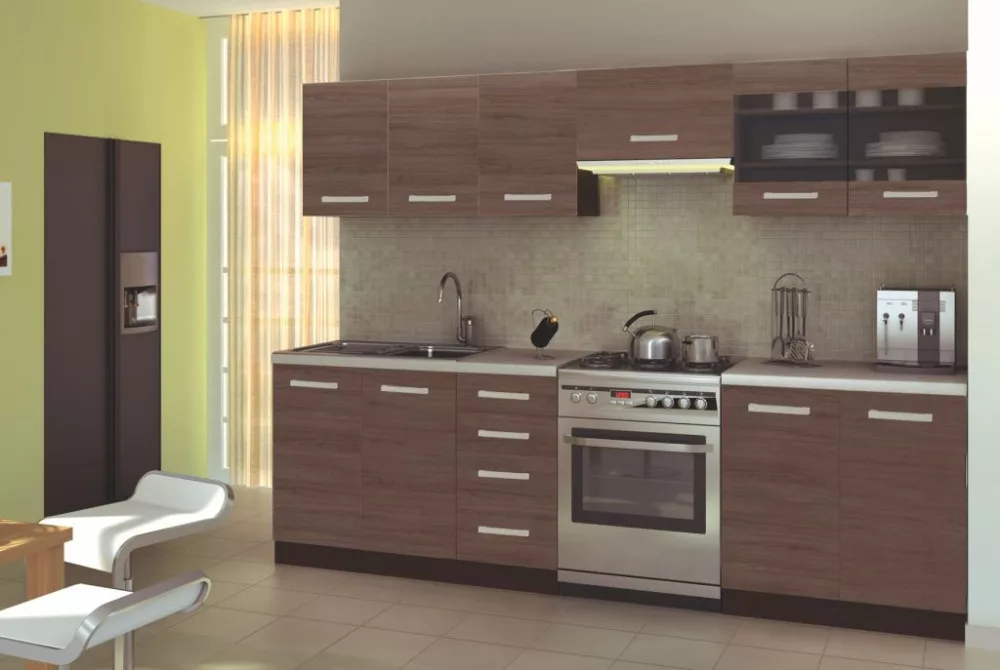 Praktikus konyhablokk, minden szükséges elemmel, hozzájuk tartozó munkalappal, gázrugós ajtókkal.