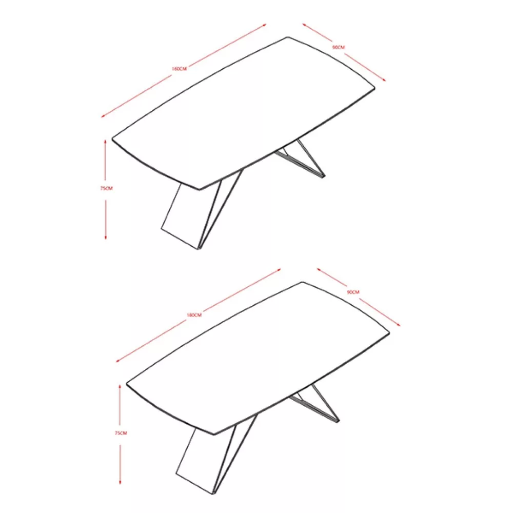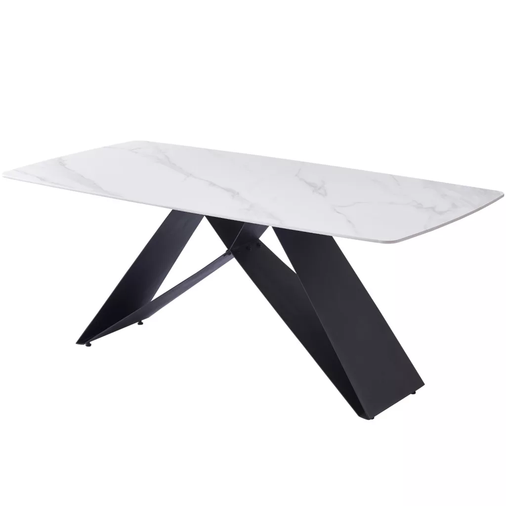 Egy étkezőasztal, amely modern dizájnjával lenyűgöz. Az 1,2 cm vastag asztallap gyönyörű fehér márvány mintázatú kerámiából készült. Az asztal alapja stílusos dizájnnal rendelkezik, amely modern megjelenést kölcsönöz az asztalnak, fémből készült és fekete színű porfestett. Az asztal két méretben kapható. A maximális teherbírás 120 kg.