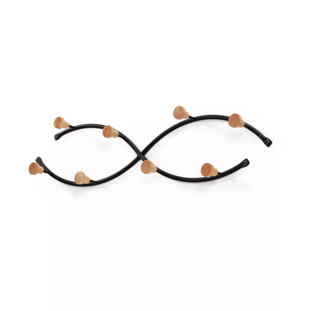 Modern fali akasztó fehér vagy fekete és natúr szín kombinációjában. A keret acélból készült és porfestett. Az akasztóhorgok gumifából készültek. Max. teherbírás 8 kg. Az akasztó már össze van szerelve.