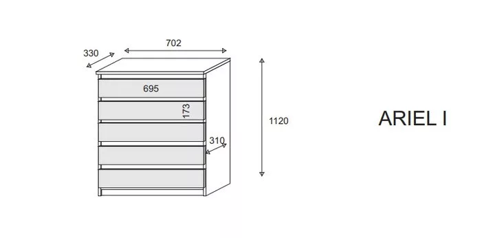Az ARIEL 1 fiókos szekrény a lengyel Meblohand gyártó modern bútordarabja, amely tökéletes hálószobába, előszobába vagy nappaliba. Minimalista dizájn és funkcionalitás jellemzi, öt tágas, fogantyú nélküli fiókkal, ami elegáns megjelenést kölcsönöz neki.