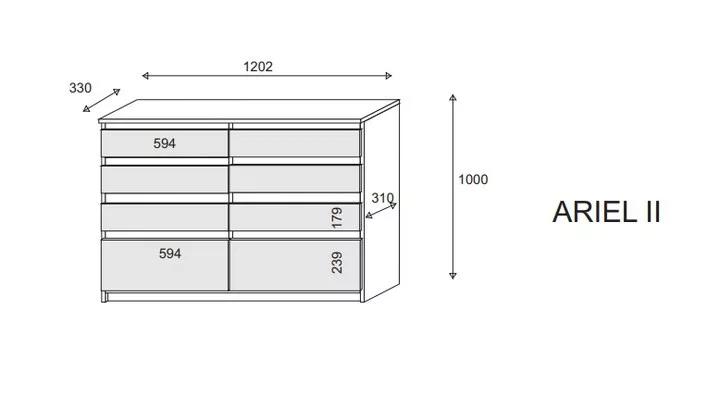 A modern ARIEL 2 fiókos komód praktikus megoldás bármilyen enteriőrbe – ideális a nappaliba, a hálószobába, az előszobába vagy a gyerekszobába. 8 tágas fiókkal rengeteg tárolóhelyet nyerhetsz!
