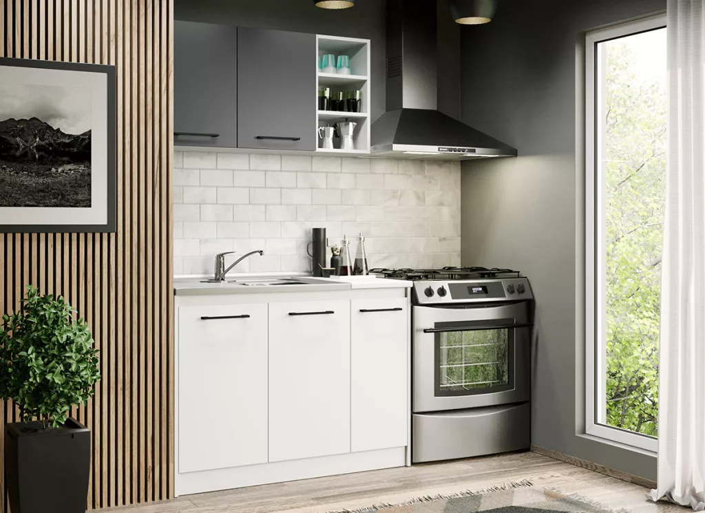 Az Arthur Konyha – 01 – 113,2 cm az első modell a kollekcióban, alsó és felső szekrényekkel, valamint tágas tárolóhelyekkel a konyhai cikkek számára. A testek 16 mm-es préselt forgácslapból készülnek. A fehér és az antracitszürke kombinációja eleganciát és kifinomultságot közvetít.