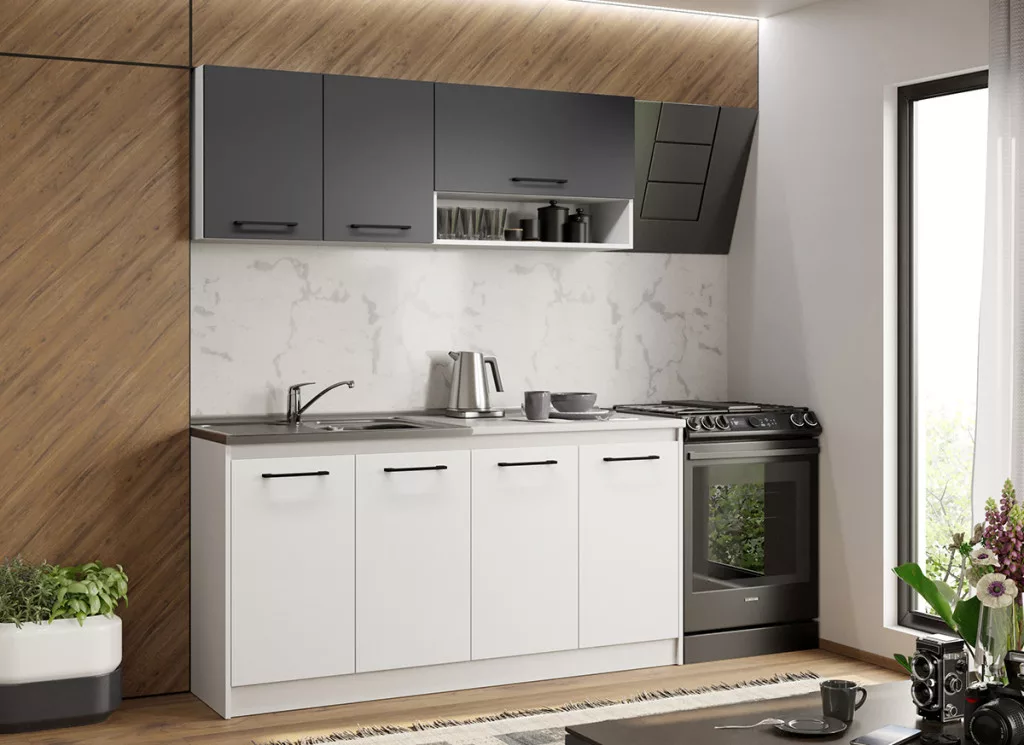 Az Arthur konyhablokk alsó, felső, és magas elemei tágas tárolóhelyet biztosít a beépíthető készülékek, és a konyhai eszközök számára. Az elemek 16 mm-es préselt forgácslapból készülnek. A gyöngyházfehér és az antracitszürke kombinációja eleganciát és kifinomultságot közvetít.