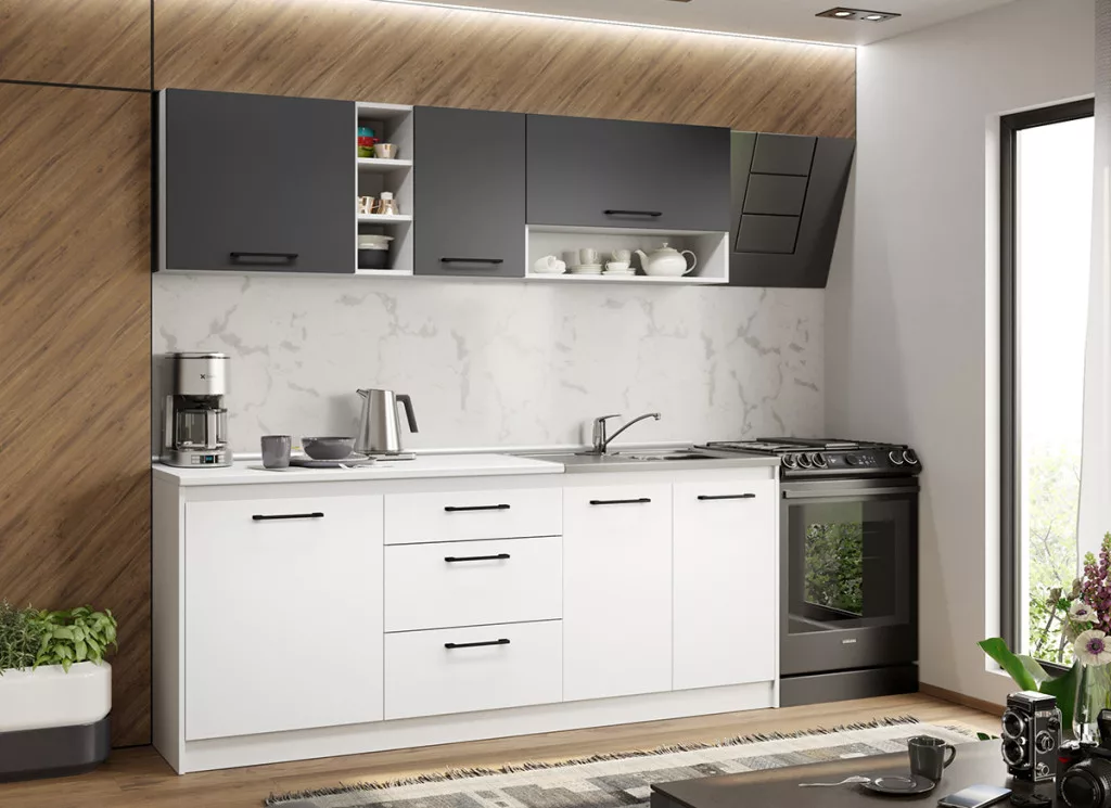 Az Arthur konyhablokk alsó, felső, és magas elemei tágas tárolóhelyet biztosít a beépíthető készülékek, és a konyhai eszközök számára. Az elemek 16 mm-es préselt forgácslapból készülnek. A gyöngyházfehér és az antracitszürke kombinációja eleganciát és kifinomultságot közvetít.