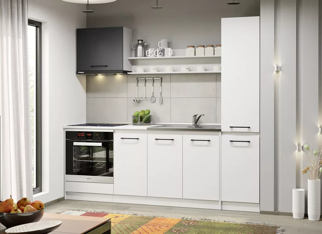 Az Arthur konyhablokk alsó, felső, és magas elemei tágas tárolóhelyet biztosít a beépíthető készülékek, és a konyhai eszközök számára. Az elemek 16 mm-es préselt forgácslapból készülnek. A gyöngyházfehér és az antracitszürke kombinációja eleganciát és kifinomultságot közvetít.