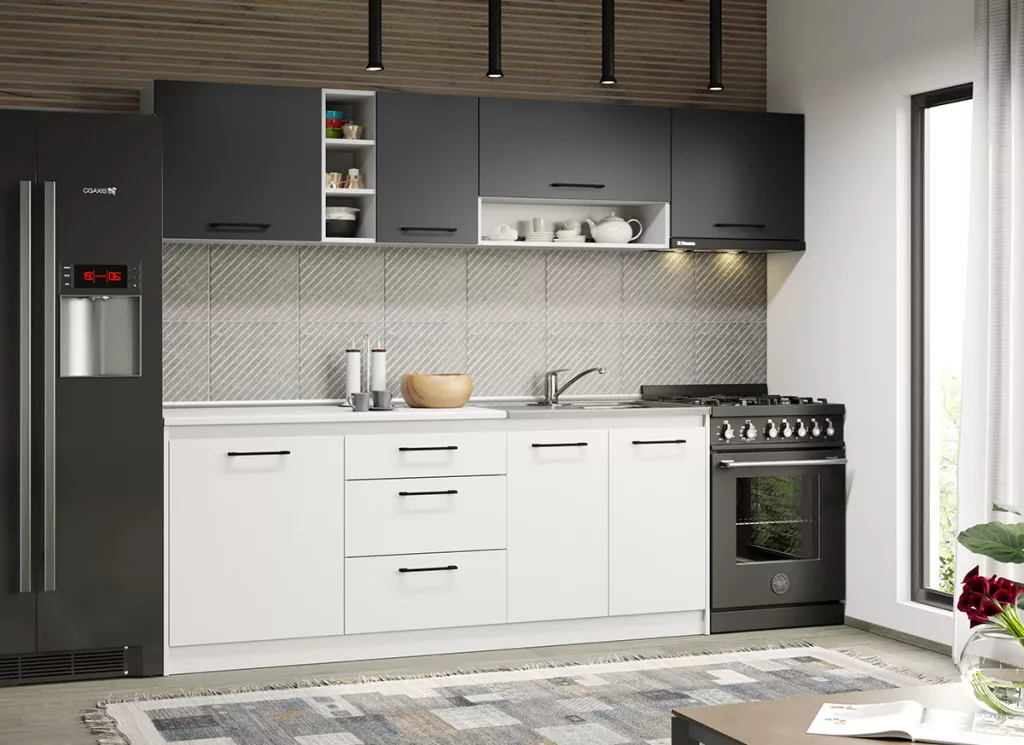 Az Arthur konyhablokk alsó, felső, és magas elemei tágas tárolóhelyet biztosít a beépíthető készülékek, és a konyhai eszközök számára. Az elemek 16 mm-es préselt forgácslapból készülnek. A gyöngyházfehér és az antracitszürke kombinációja eleganciát és kifinomultságot közvetít.