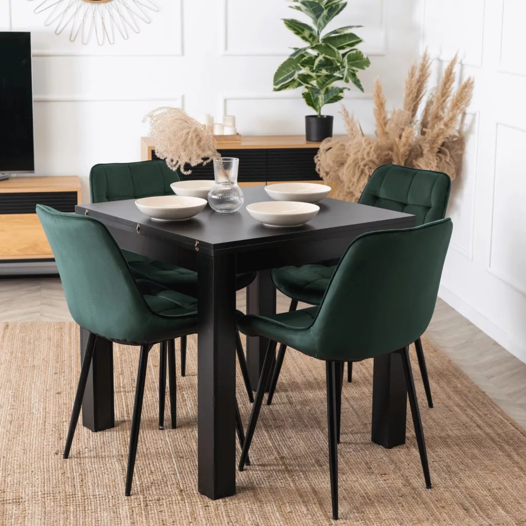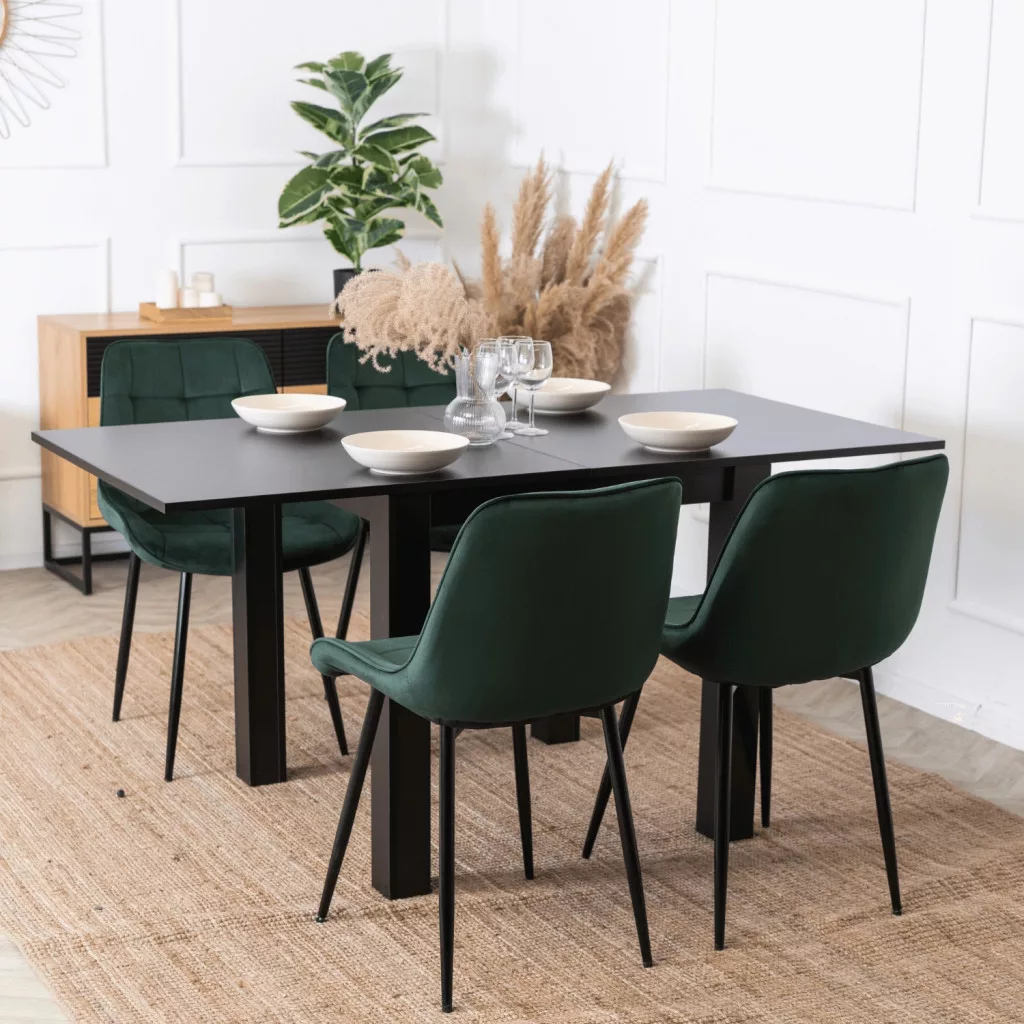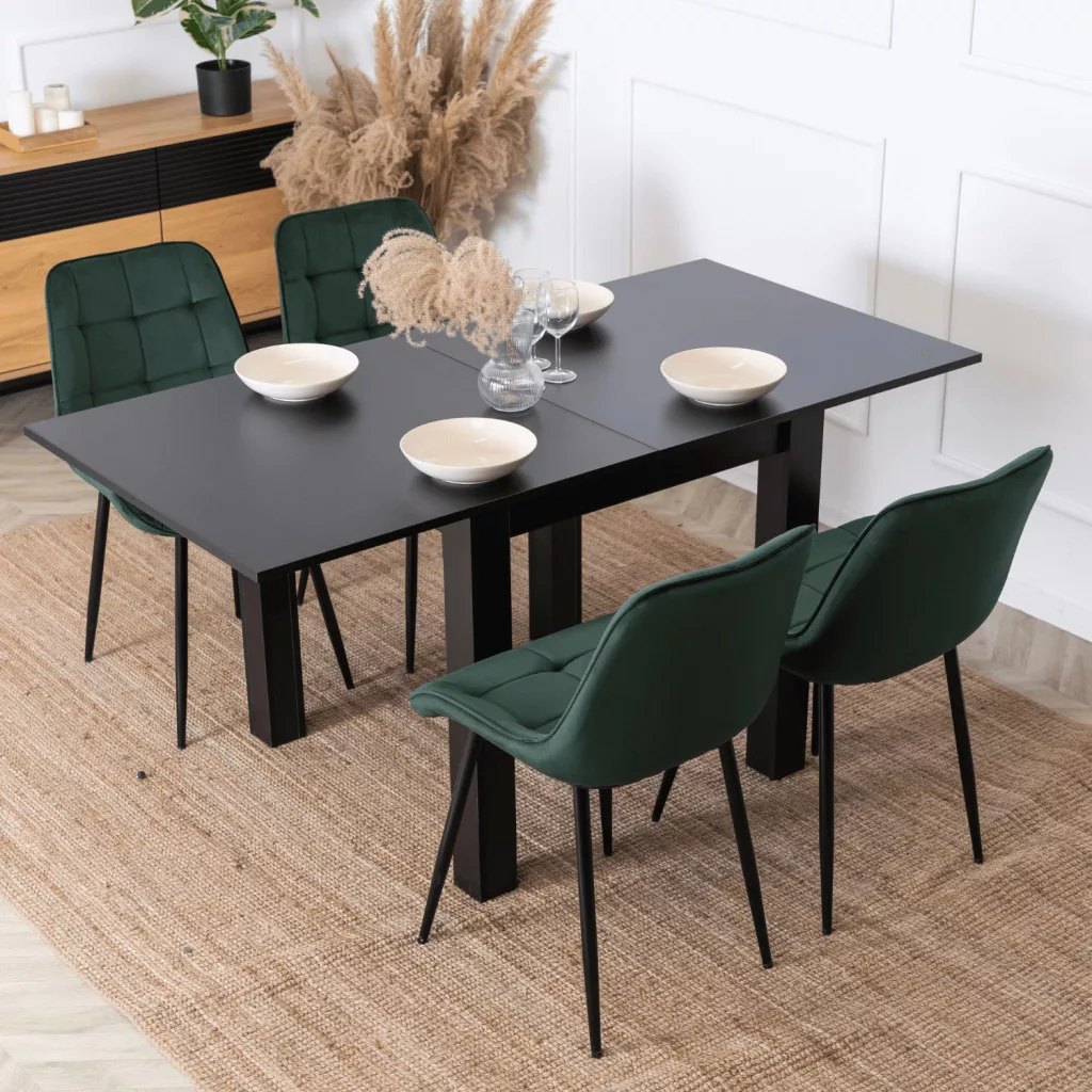 A MAX kinyitható étkezőasztal fekete változata egy erőteljes, markáns megjelenésű bútor, amely a kisebb étkező terek intelligens megoldása. Az asztal alapmérete 80×80 cm négyzetes kialakítású, ami mindennap könnyen kezelhető méret, vendégek fogadásakor pedig egyszerűen 160 cm-re nyitható ki. A teljes fekete kivitel egységes, kontrasztos megjelenést biztosít, amely kiváló alapja lehet egy black & white interiőrnek, de szürke vagy fa tónusú elemekkel is jól harmonizál. A forgácslap alapanyag tartós és kopásálló felületkezeléssel van ellátva, ami garantálja az asztal hosszú élettartamát. A 78,5 cm magasság standard étkezőmagasság, amelyhez szinte bármilyen kereskedelemben kapható étkezőszék illeszthető. A négyzetlap forma kisebb terekbe is ideálisan elhelyezhető: sarokba tolva, falnak állítva, de középre is kitűnően mutat. A MAX asztal bővítési mechanizmusa egyszerű és megbízható: az asztallap két szimmetrikus részből áll, amelyek szétnyílásakor a betétlap automatikusan a helyére kerül. A kinyitott 160 cm hosszú asztal 6-8 személynek is elegendő helyet biztosít, ünnepi alkalmakra is tökéletesen megfelel. A fekete szín egy másik fontos előnye, hogy kevésbé mutatja a szennyeződést és a kopásnyomokat, mint a világosabb felületek. Ez különösen fontos egy aktívan használt étkezőasztalnál. Loft, industrial, minimal vagy black design – a MAX fekete asztal mindegyik stílushoz tökéletesen passzol.