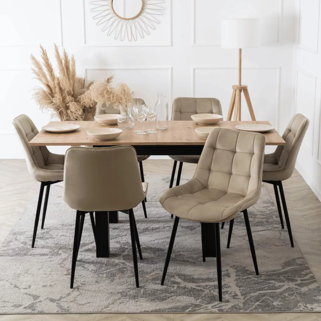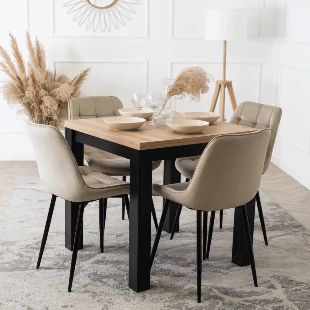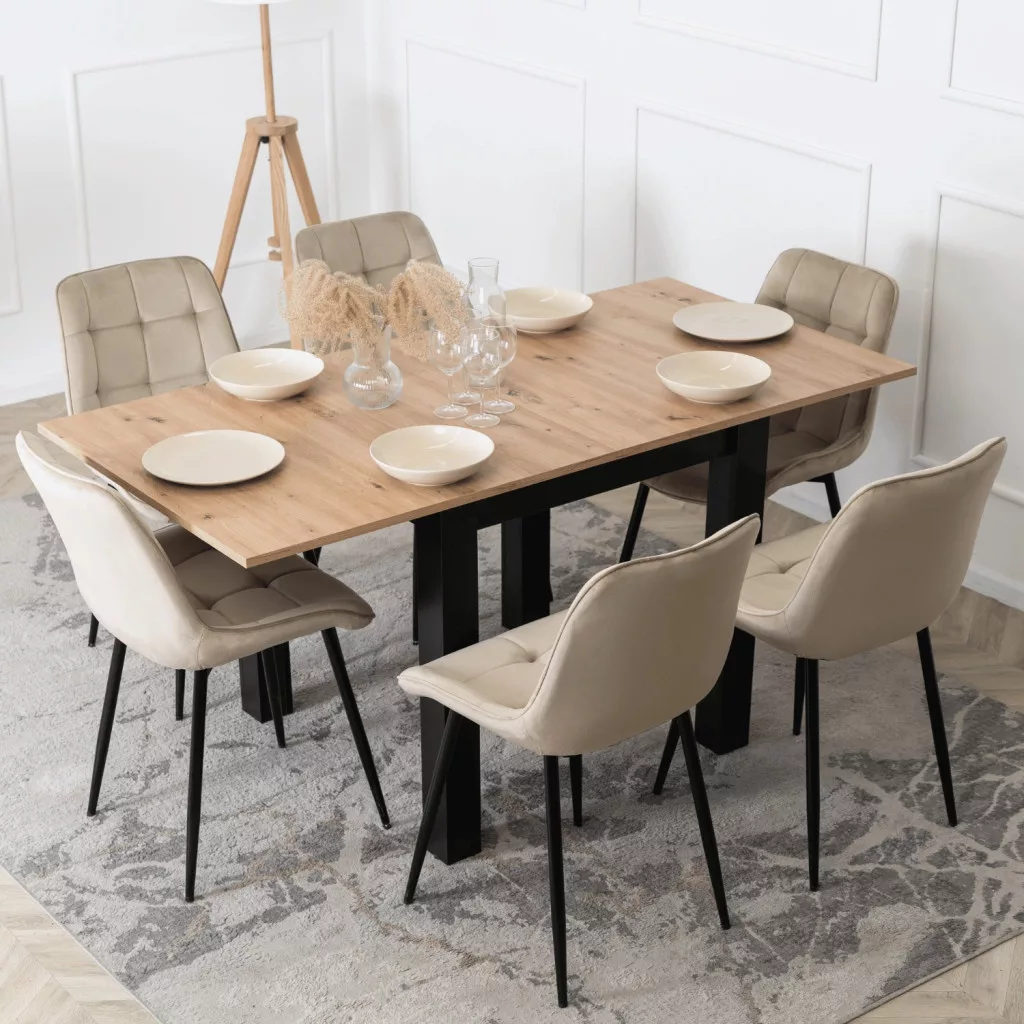 A MAX kinyitható étkezőasztal egy okos megoldás minden olyan otthon számára, ahol a hely szűkös, de az étkezőnek mégis tudnia kell fogadni több vendéget. Az asztal alapmérete 80×80 cm, ami elegendő hely a mindennapi 4 személyes étkezéshez, de szükség esetén egy egyszerű mozdulattal 160 cm hosszúságra nyitható ki, megduplázva az asztallap méretét. Az asztal tölgy Artisan és fekete színkombinációban készült, ami egy modern, loft ihletésű dizájnt eredményez. Az Artisan tölgy felület meleg, természetes hatású, míg a fekete elemek erős kontrasztot és kortárs karaktert adnak a bútoroknak. Ez a kombináció kiválóan illik ipari, skandináv vagy urban lakásokhoz egyaránt. A MAX asztal forgácslapból készült, amelyet tartós és kopásálló felületkezeléssel láttak el. A 78,5 cm-es magasság standard étkezőmagasságot jelent, így az asztalhoz szinte bármilyen standard étkezőszék kerülhet. Az alapterület 80×80 cm, ami négyzetes alapformát jelent – ez a kialakítás különösen kedvező kisebb étkező terekben, ahol egy hosszú asztal nem férne el. Kinyitott állapotban az asztal 80×160 cm-re bővül, amely már 6-8 személynek is elegendő helyet biztosít. A bővíthető asztal mechanizmusa egyszerűen kezelhető, és az asztallap elemei kinyitás után stabilan, biztonságosan rögzülnek. Ez az asztal egyszerre praktikus hétköznap és ünnepi alkalmakra is tökéletes választás. Ha a tárhely és a rugalmasság egyszerre fontos szempont, a MAX asztal az egyik legjobb döntés.