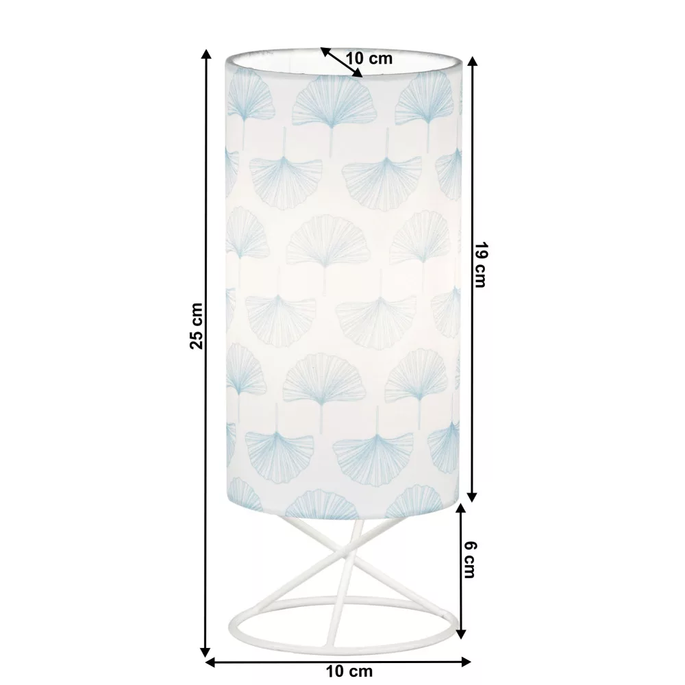 AVAM asztali lámpa Anyag: fém/textil Szín: fehér/mintás Teljes méret (SzxMéxMa): 10x10x25 cm Talapzat méretei (SzxMéxMa): 10x10x6 cm Lámpaernyő méretei (SzxMéxMa): 10x10x19 cm Izzó nélkül szállítva Ajánlott izzó típus (menet): E14 Az izzó maximális teljesítménye: 40 W Kábel hossza: 1,3 m Súly: 0,2 kg Modern dizájn Szétszerelve szállítva