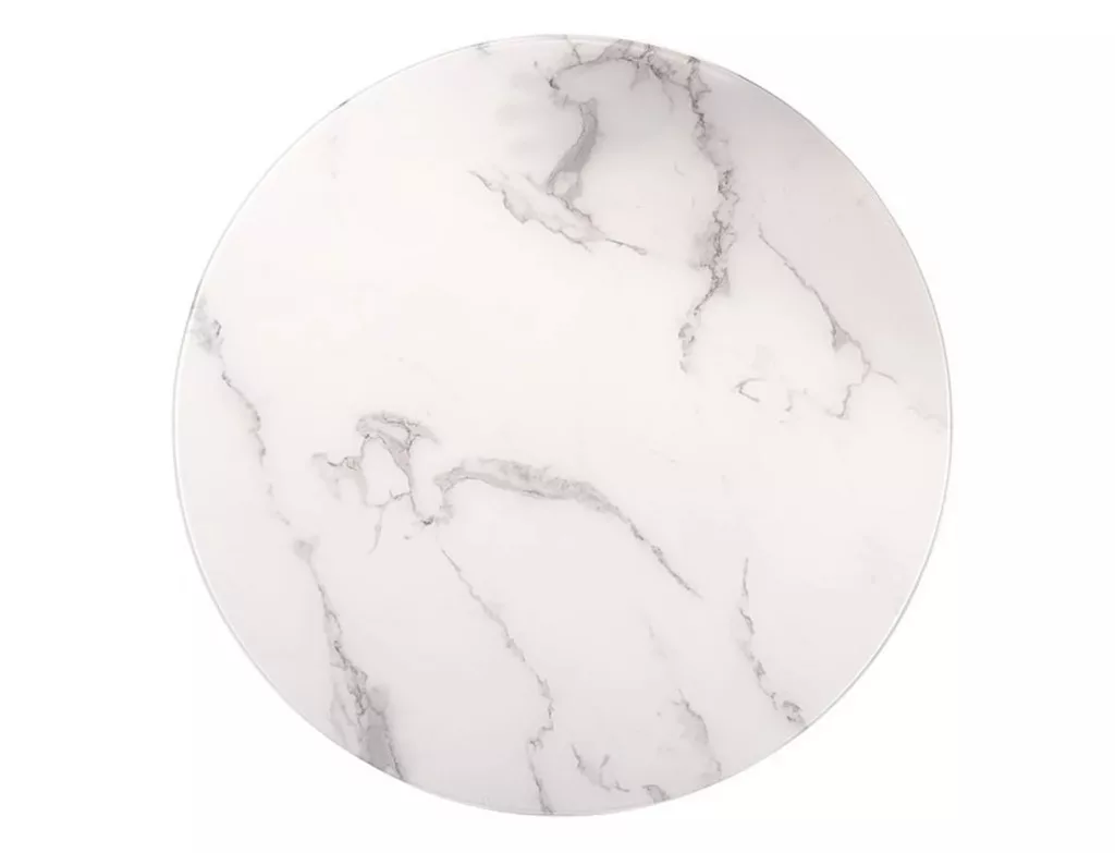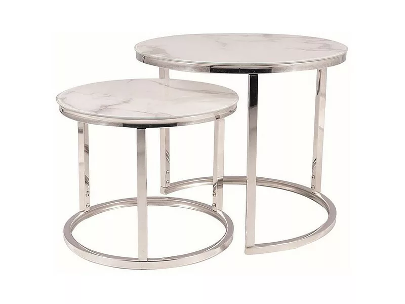 Kávézóasztal szett, asztallap: üveg, keret: fém, szín: fehér, márványhatású / króm. A kisebb asztal méretei: átmérő: 43, magasság: 35 cm.