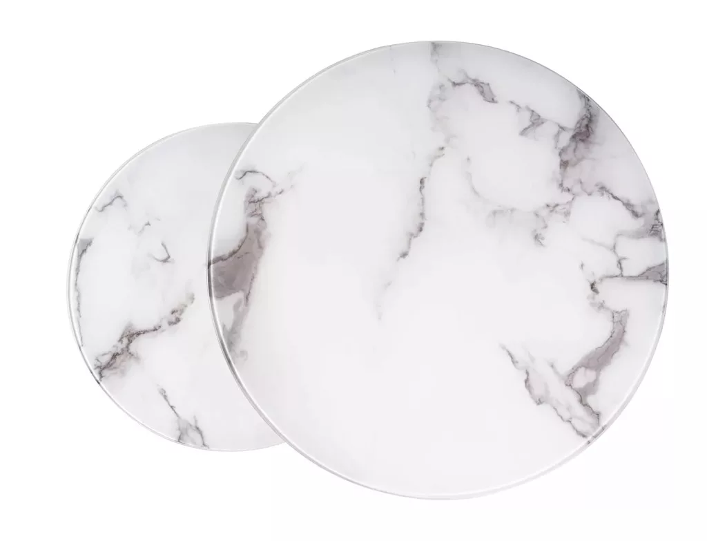 Kávézóasztal szett, asztallap: üveg, keret: fém, szín: fehér, márványhatású / króm. A kisebb asztal méretei: átmérő: 60, magasság: 42 cm.