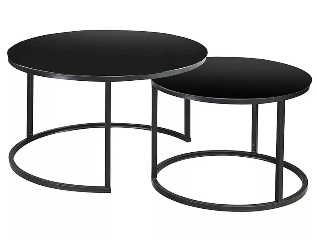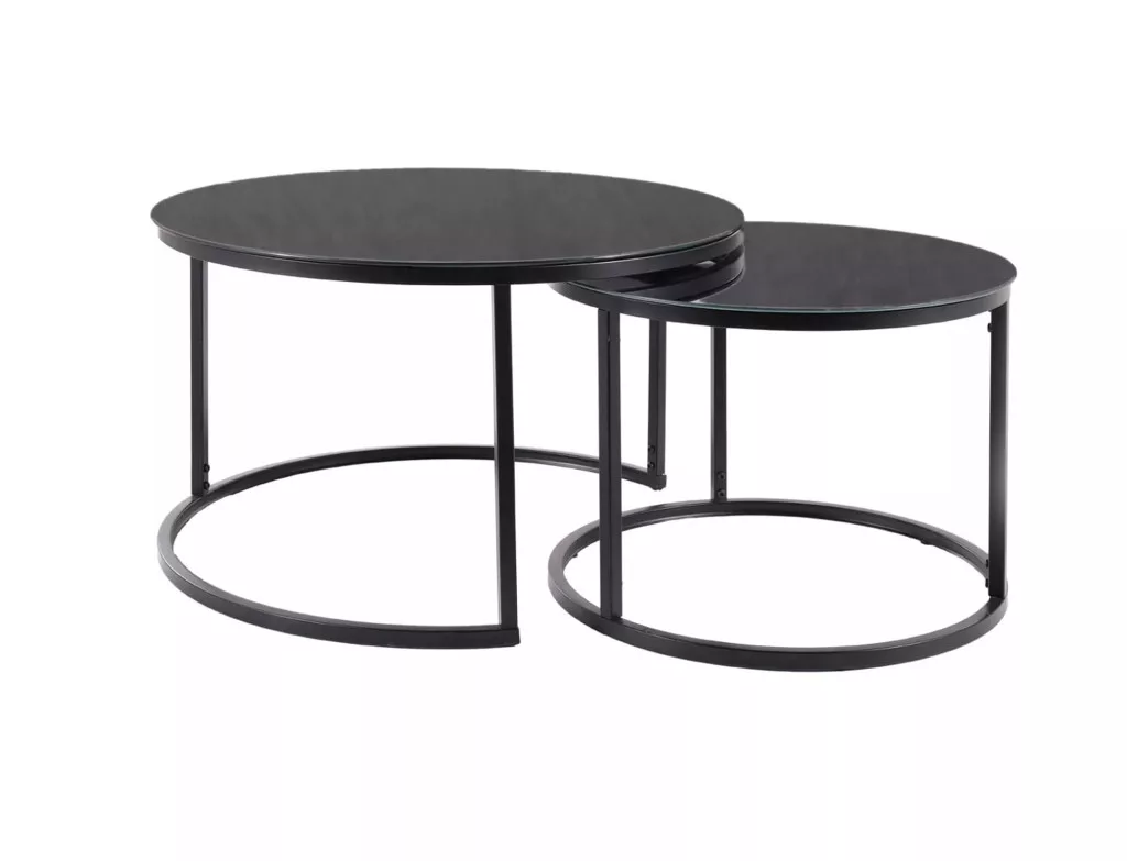 Kávézóasztal szett, asztallap: üveg, keret: fém, szín: fekete / matt fekete. A kisebb asztal méretei: átmérő: 60, magasság: 42 cm.
