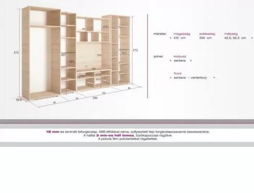 18 mm-es laminált forgácslapból készül, ABS élfóliával zárva, süllyesztett fejű forgácslapcsavarral összeszerelve.