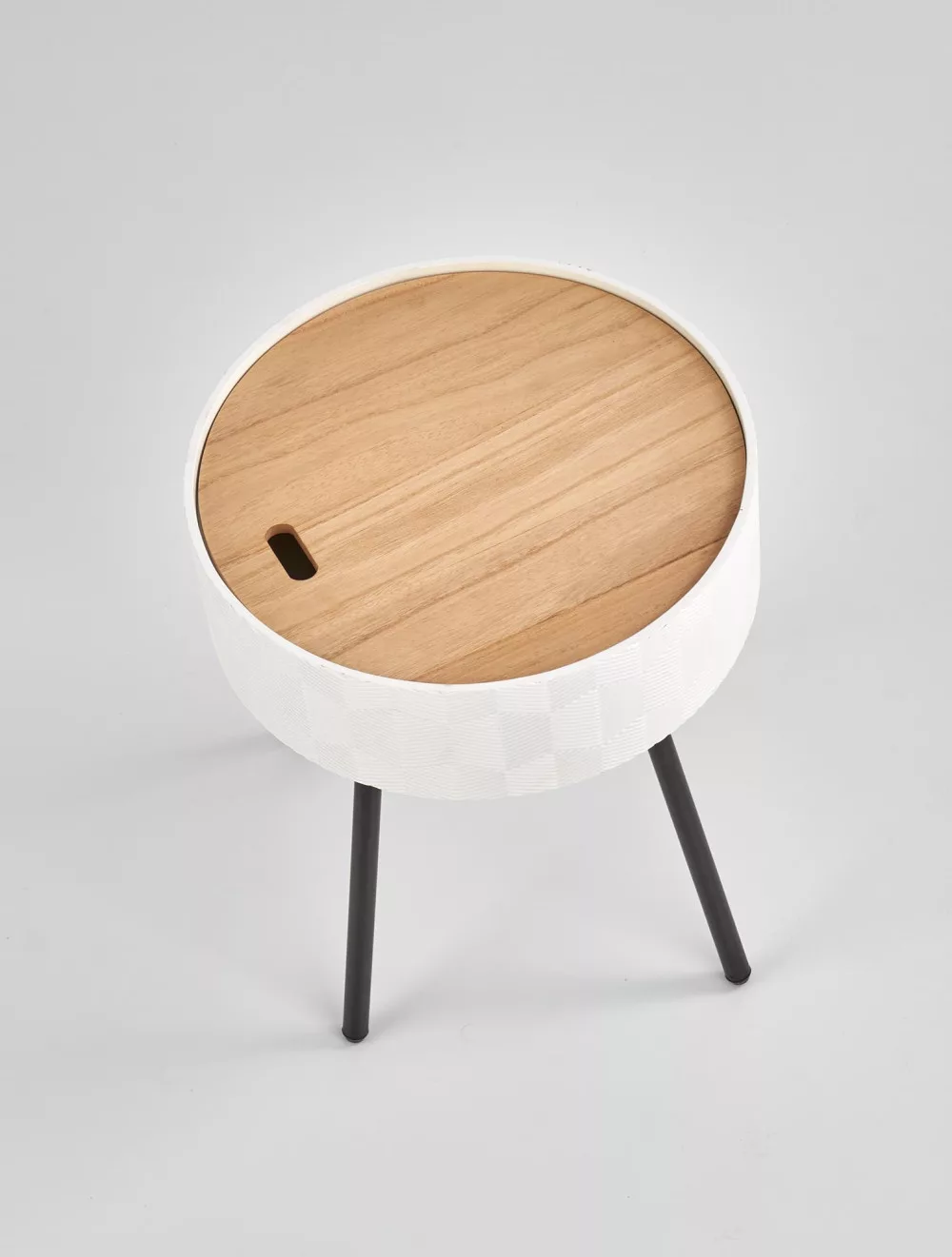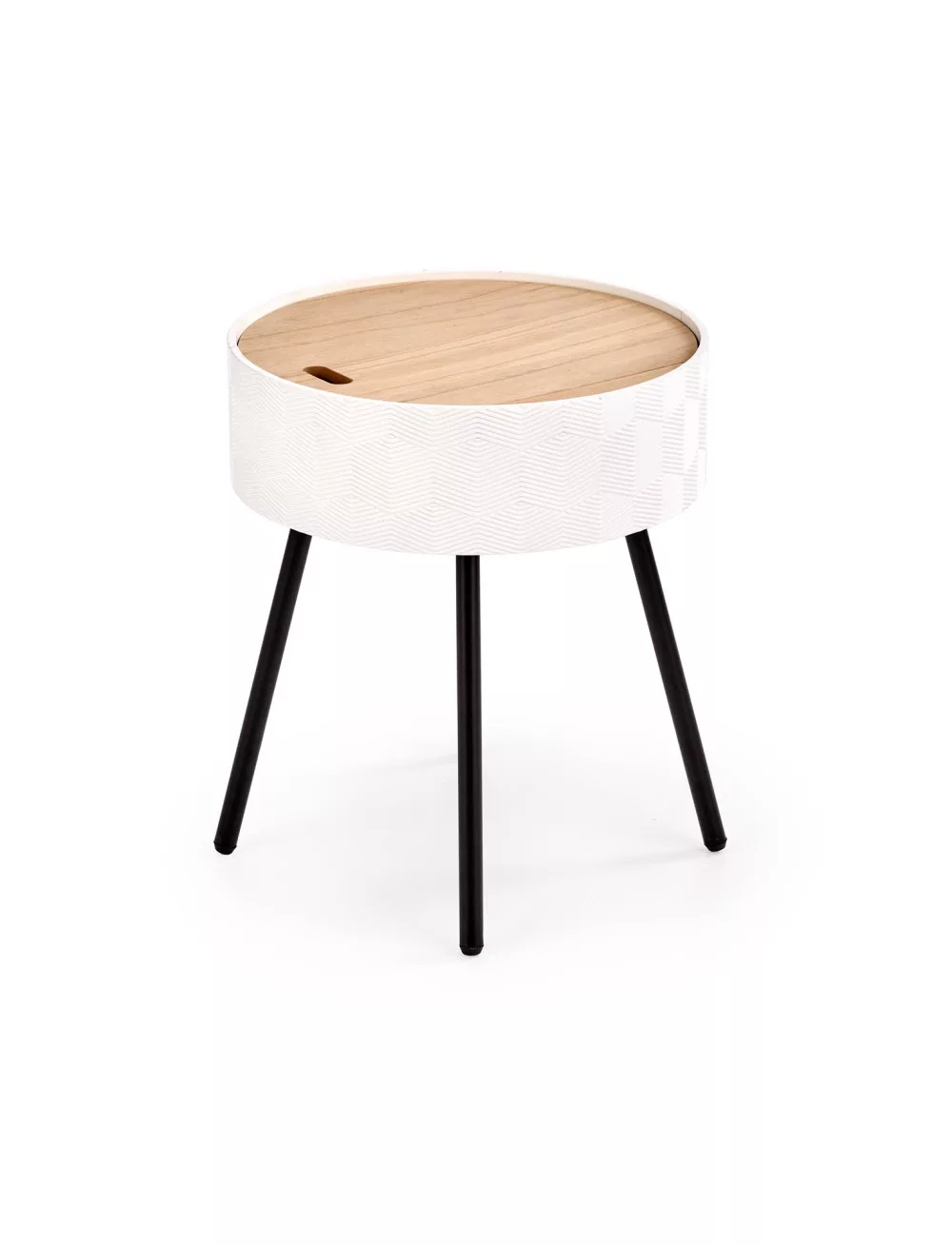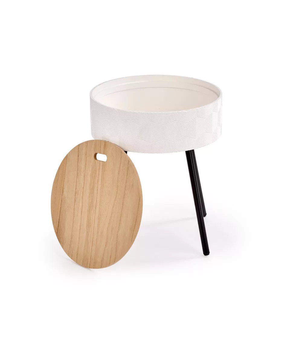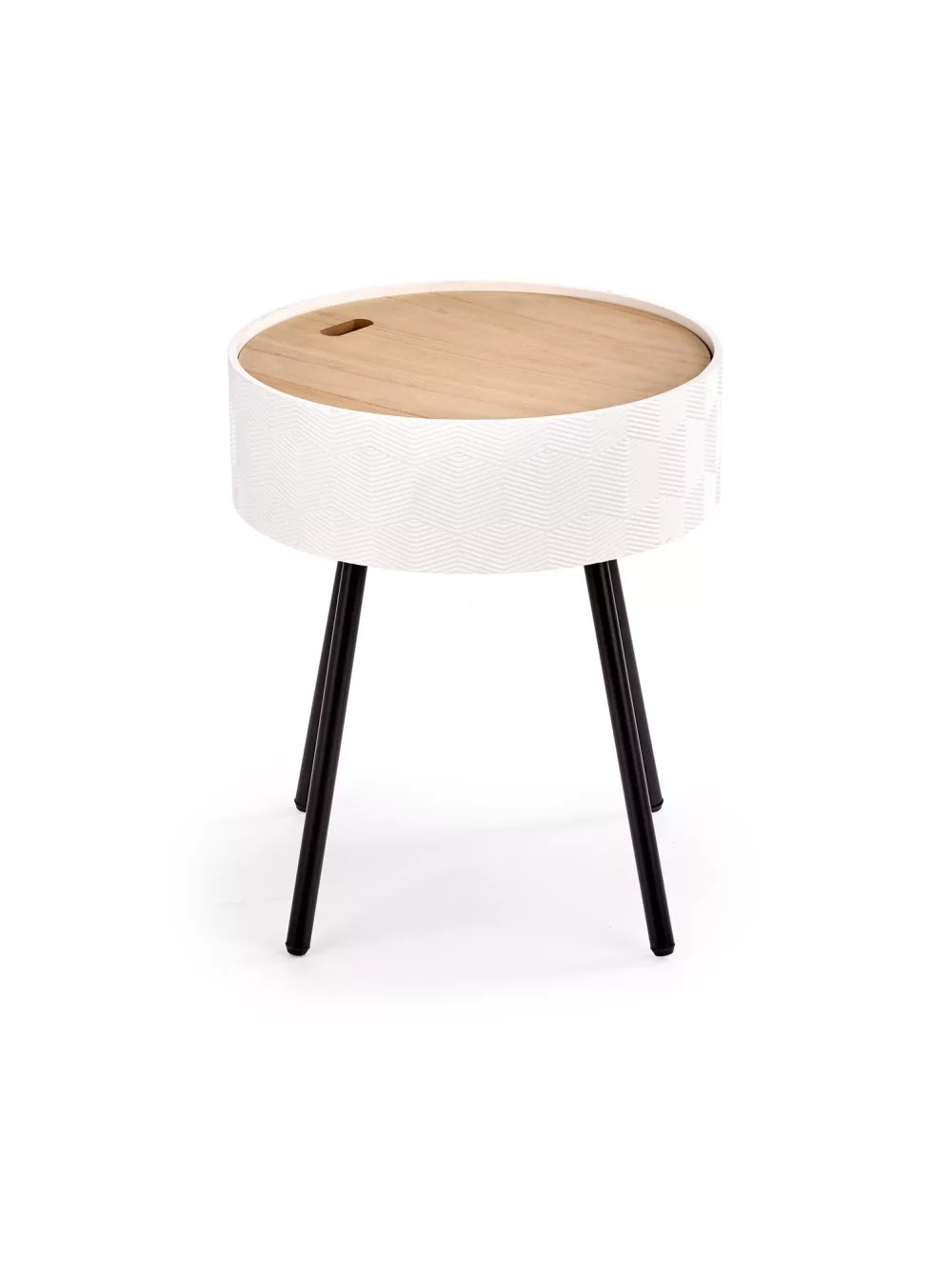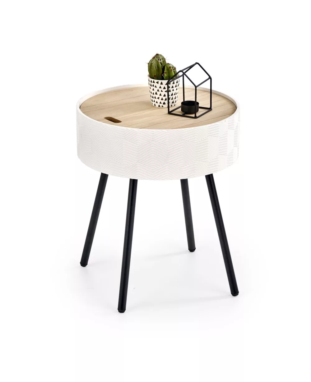 Modern kialakítású dohányzóasztal, praktikus tárolórésszel. A natúr színű asztallap tömörfából, körben lakkozott MDF-ből, míg a láb porszórt acélból készült.