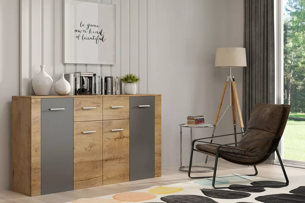 Az Aurora 2 komód nagyszerű választás nappaliba, étkezőbe vagy a hálószobába. A lancelot/szürke színének köszönhetően a szekrény kombinálható sok más bútorral.