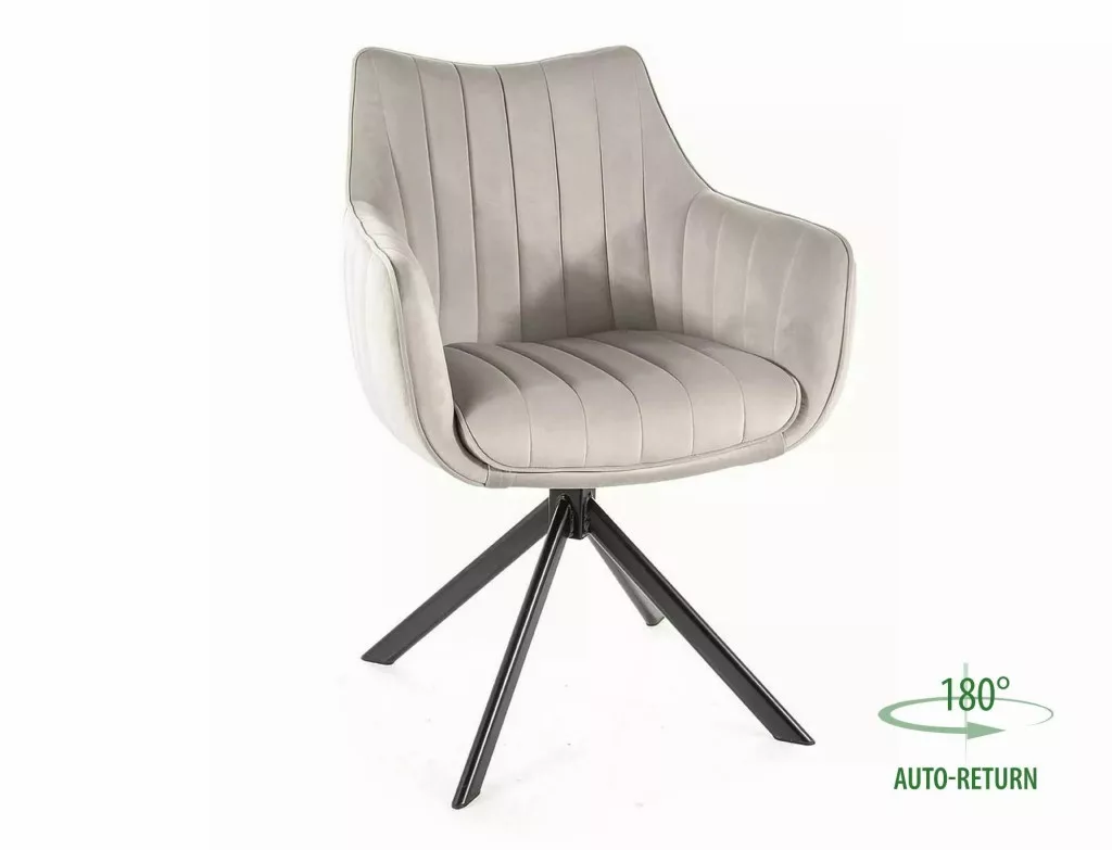 Szék, bársony szövet: Bluvel 03 - világos szürke, váz: fém, szín: matt fekete. Az ülés 180 fokban elforgatható, visszaforgató funkcióval.