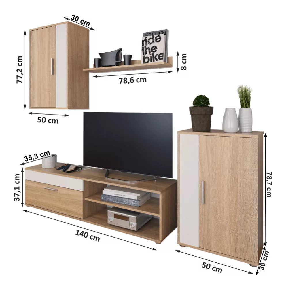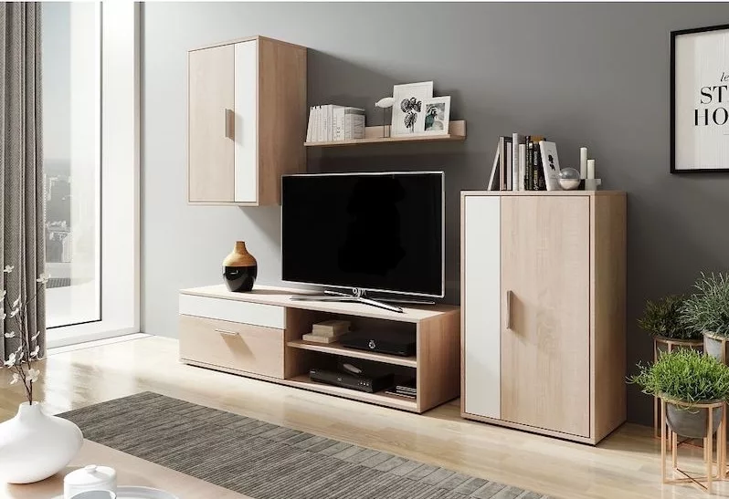A nappali fal polcból, függesztett szekrényből, komódból és TV-asztalból áll.