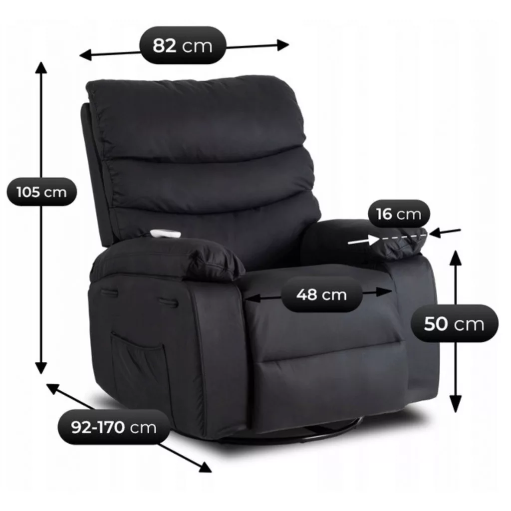 BRUCE Fekete Dönthető Masszázsfotel. Fáradt munka után? A tested azt mondja: "elég", de az elméd egy pillanatnyi nyugalomra vágyik? Az elegáns fekete dizájnú Bruce fotel a személyes szentélyed – egy puha hely a pihenésre, egy kényelmes menedék a nap végén, és egy privát masszőr egyben. Többé nem kell kifogásokat keresned a pihenésre. Otthon van – mindig készen áll, hogy gondoskodjon rólad. A fotel fő előnyei: dönthető funkció – ülj le, dőlj hátra, és engedd meg magadnak a valódi ellazulást; 360°-ban forgó talp – könnyedén változtathatod az ülési pozíciót és irányt; ringató funkció – a gyengéd ringatás megnyugtatja a testet és az elmét; masszázs funkció – hatékony izomlazítás, amikor csak szükséged van rá.