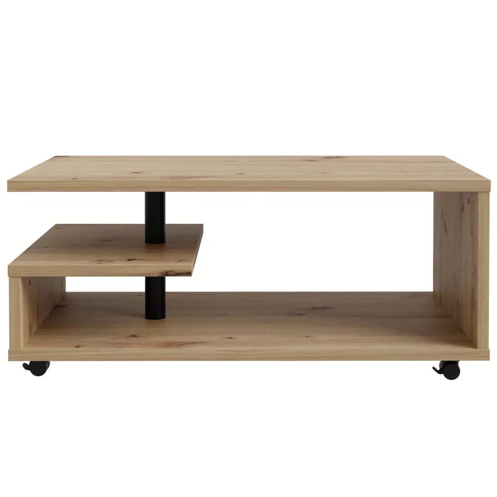 Az asztallap téglalap alakú formája egy folyamatos, többszintes konstrukcióba megy át, amely szépen ötvözi az asztallap felületét az eltolt polcokkal a kisebb tárgyak tárolására. A teljes dohányzóasztal tartós MDF anyagból készült.