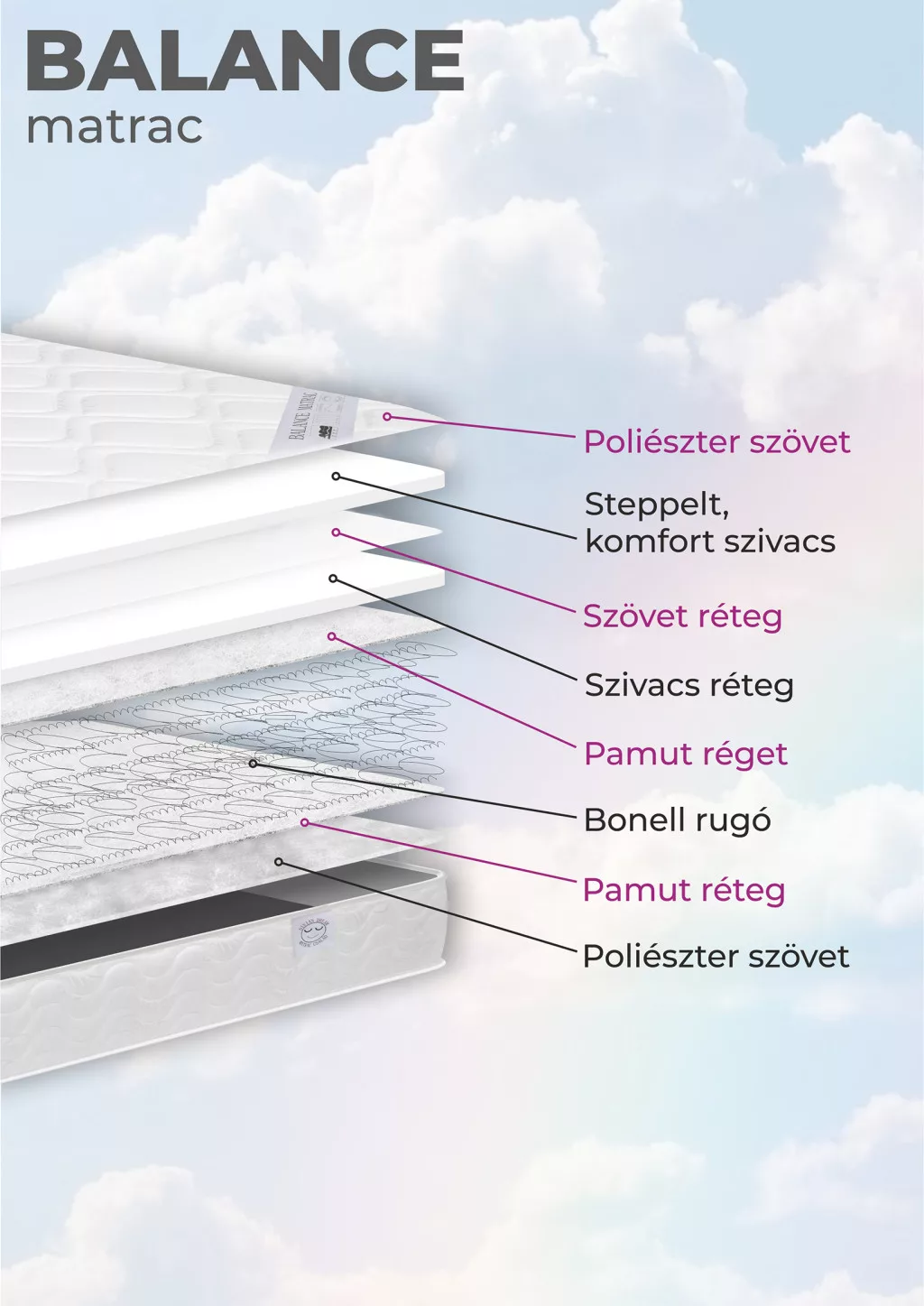 Erős, könnyen kezelhető külső szövet borítja. A különböző sűrűségű szivacs rétegek kényelmes és jó alvás szolgálatában állnak. Bonell rugói stabil és rugalmas alátámasztást nyújtanak a teljes test számára. Jó szellőző képességgel rendelkezik.
