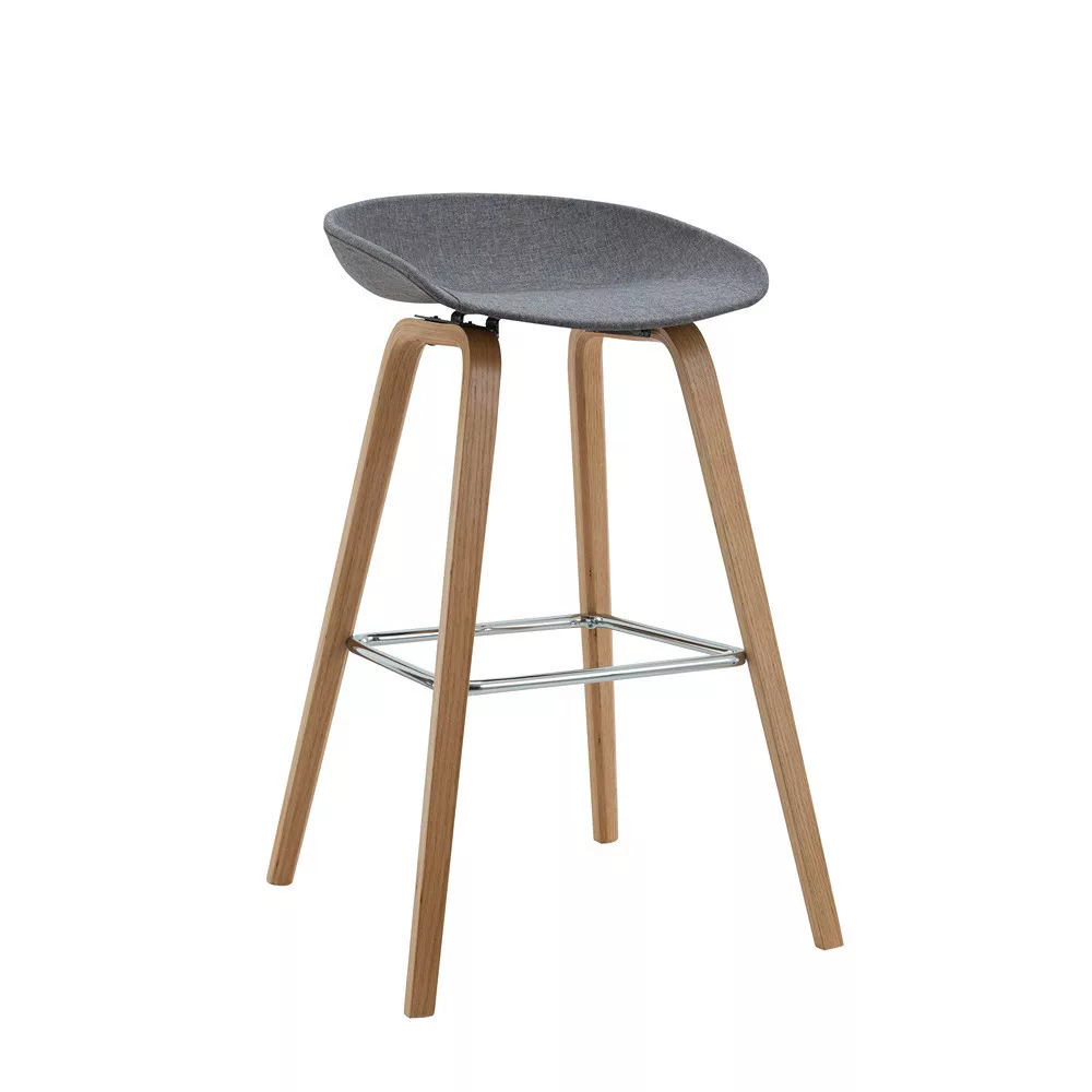 Minimalista bárszék kontúrozott ülőfelülettel, minőségi szürke színű szövettel kárpitozva. Enyhén ívelt ülőfelületével és hosszú, elegáns fa lábaival egyszerű, mégis jellegzetes vizuális megjelenéssel rendelkezik, így ideális bárszékként szolgálhat különféle vállalati, nyilvános és magán környezetben. A kétrészes váz bükkfából készült, natúr felületkezeléssel. Az ülőfelület magassága 78 cm. A lábakat krómozott lábtartó köti össze, amely terhelés alatt is jó stabilitást biztosít a széknek. A bárszék maximális teherbírása 120 kg.