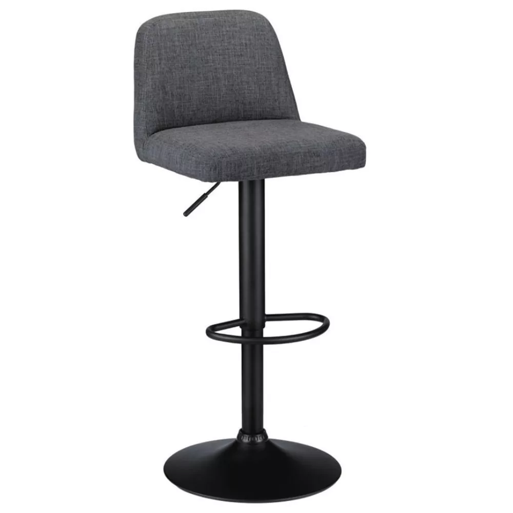 Praktikus bárszék, szürke színben kapható. A szék forgatható és magasságban állítható, a tartóoszlopban gázmechanizmus található. Az ülőfelület magassága 61 és 81 cm között állítható. A lekerekített sarkú ülőfelület és háttámla puha szövettel kárpitozottak, az alap pedig félhold alakú lábtartóval van ellátva. A tartóoszlop fémből készült és porfestett a jobb védelem érdekében. A kerek padlólap jó stabilitást biztosít. A bárszék maximális teherbírása 120 kg.