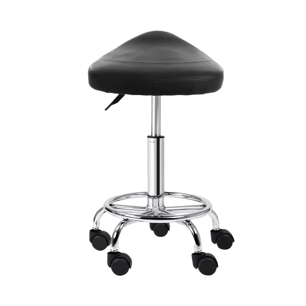 Modern bárszék kerekeken, nyereg alakú ülőfelülettel. A szék teljesen forgatható és magasságában állítható, a fő tartóoszlopban gázmechanizmus található. Az ülőfelület fekete műbőrrel kárpitozott, a legszélesebb pontján 36 cm széles. A szék váza krómozott, matt felületkezelésű. A váz kerek lábtartóval és öt fekete kerékkel is fel van szerelve, amelyek lehetővé teszik a szék gyors és egyszerű mozgatását a helyiségben. Maximális teherbírás 120 kg.