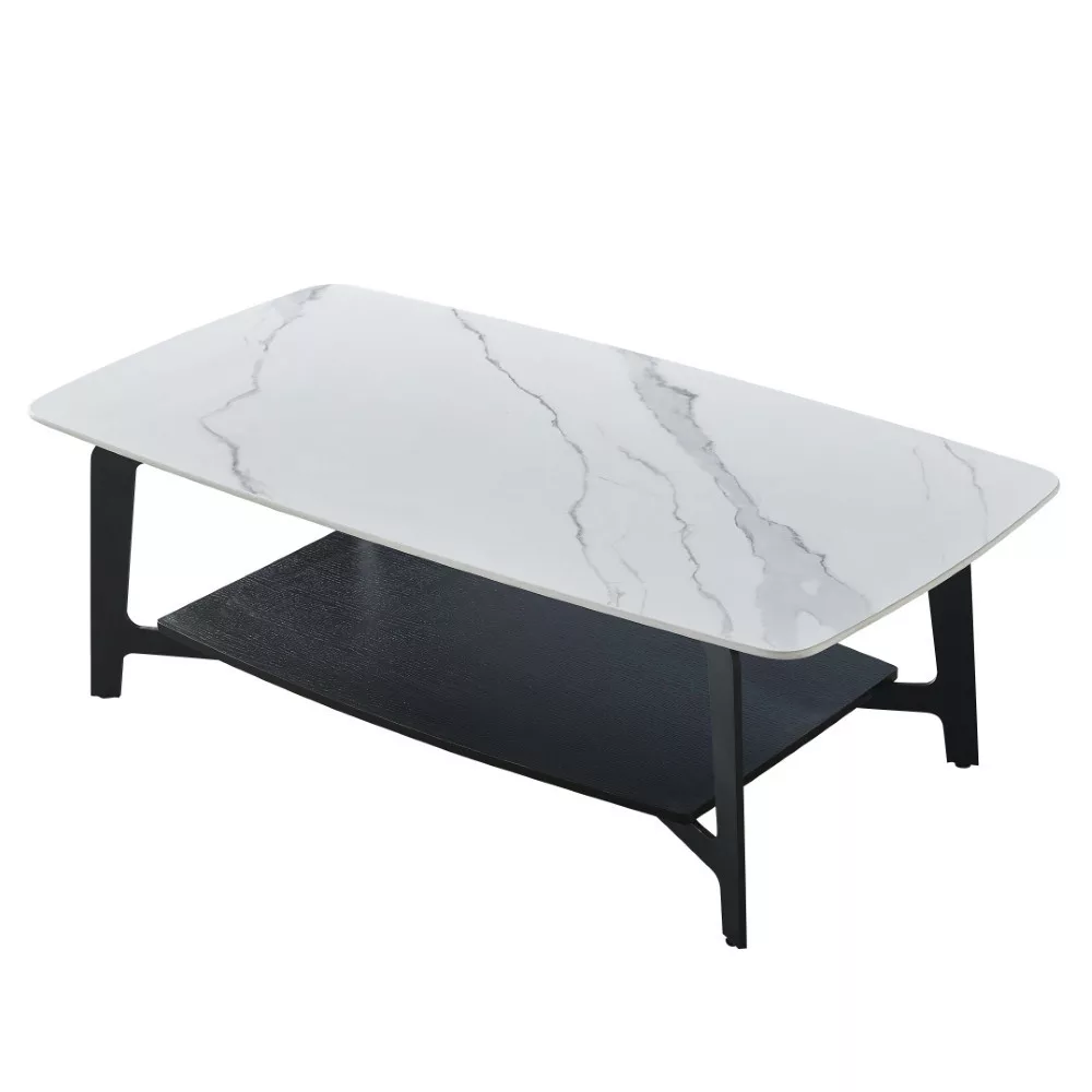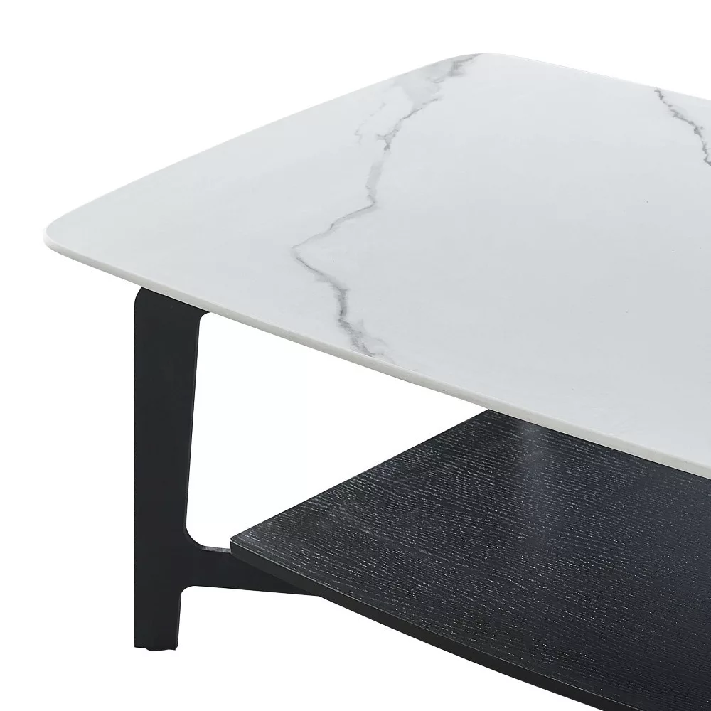 Praktikus dohányzóasztal, Hófehérke színben, márvány mintával és matt fekete lábakkal. Az asztallap teljes egészében szinterezett kőből készült, 12 mm vastag és lekerekített sarkokkal rendelkezik. A szinterezett kő különböző színű természetes kövek kombinációjából készül, és számos előnnyel rendelkezik a hagyományos kerámiákkal szemben. Erősebb, mint a nagy kerámialapok, és nem törik könnyen. A természetes gránitból készült lapokhoz képest természetesen vízálló is. Ezenkívül környezetbarátabb is, mint a kémiailag kezelt kvarclapok. Az asztallap alatt egy nagy polc található, ahol magazinokat, poharakat, poháralátéteket stb. helyezhet. Az asztal alapja fémből készült, és porfestett a jobb védelem érdekében. Az alsó polc MDF anyagból készült, fekete színű, a fém alap árnyalatával megegyező árnyalatban. A kerámia asztallap maximális teherbírása 30 kg.