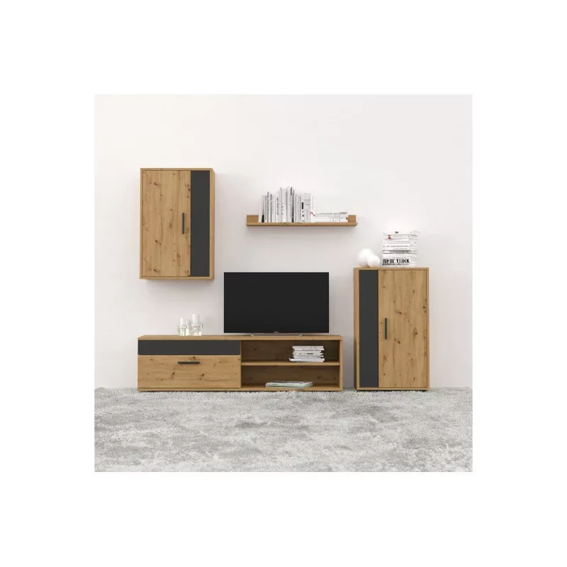 A nappali fal polcból, függesztett szekrényből, komódból és TV-asztalból áll.