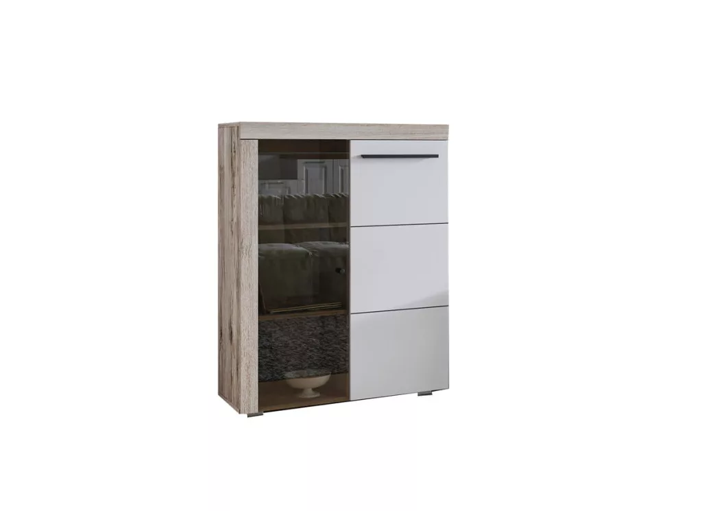 a klasszikus és minimalista stílust ötvözi a modernnel. A komódot 6 polc tagolja, amelyek közül 3 ajtóval, a másik 3 pedig üvegajtóval van eltakarva, így a díszítőelemek és a holmijaid jól láthatóak. A komód váza lehetővé teszi, hogy a korpuszt felfüggesztve, a TV-szekrény mellé vagy a padlóra helyezve is elhelyezzük. A komód anyaga melamin forgácslap,