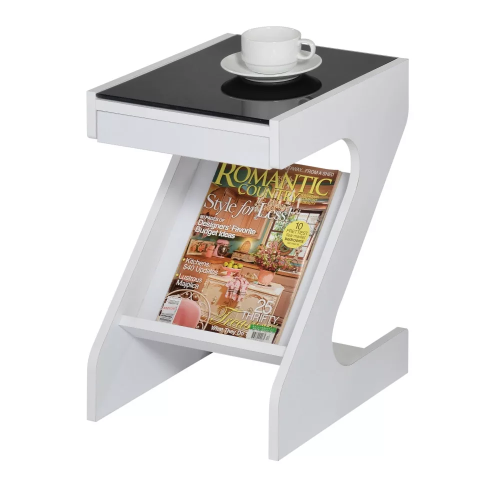 Egy egyszerű, multifunkcionális dohányzóasztal, amely feldobja otthonát. Az asztal egyedi formájának köszönhetően nagyon sokoldalú. Fehérre festett fából készült. Tetején egy 0,5 cm vastag fekete edzett üveglap található. Az asztalon egy kis fiók is található, alatta pedig egy polc, amelyre újságokat, magazinokat stb. helyezhet. Különleges formájának köszönhetően az asztalt fekvés közben is könnyedén közelebb hozhatja a kanapéhoz. A maximális teherbírás 15 kg.