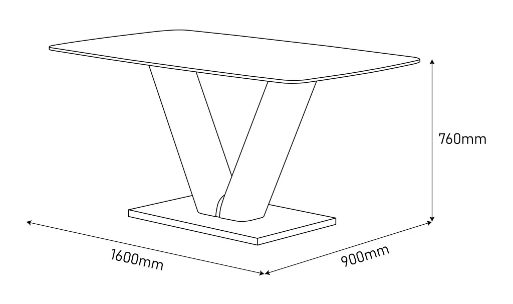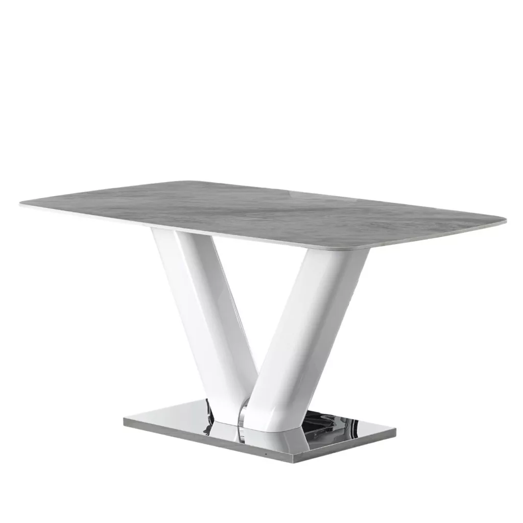 Kerámia étkezőasztal szürke asztallappal, szinterezett kőből készült. Az asztallap téglalap alakú, lekerekített sarkokkal, mérete 160x90 cm, vastagsága egyenletesen 10,5 mm. A szinterezett kő több különböző színű természetes kő kombinációjából készül, és számos előnnyel rendelkezik a hagyományos kerámiával szemben. Erősebb, mint a nagyobb kerámialapok, és nem törik könnyen, a természetes gránitlapokhoz képest pedig természetesen vízálló. Környezetbarátabb is, mint a kémiailag kezelt kvarclapok. Az asztal magassága 76 cm. Az asztal tartóoszlopai fehér MDF anyagból, a stabilitást biztosító padlólap pedig rozsdamentes acéllal bevont MDF anyagból készült. Az asztal maximális teherbírása 50 kg.