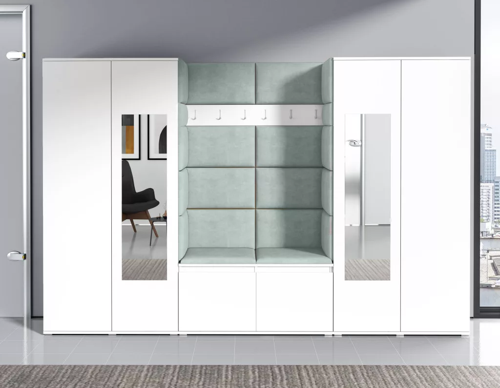 Blum 10 kárpitozott előszobafal tükörrel, fehér - menta 21 - egyedi