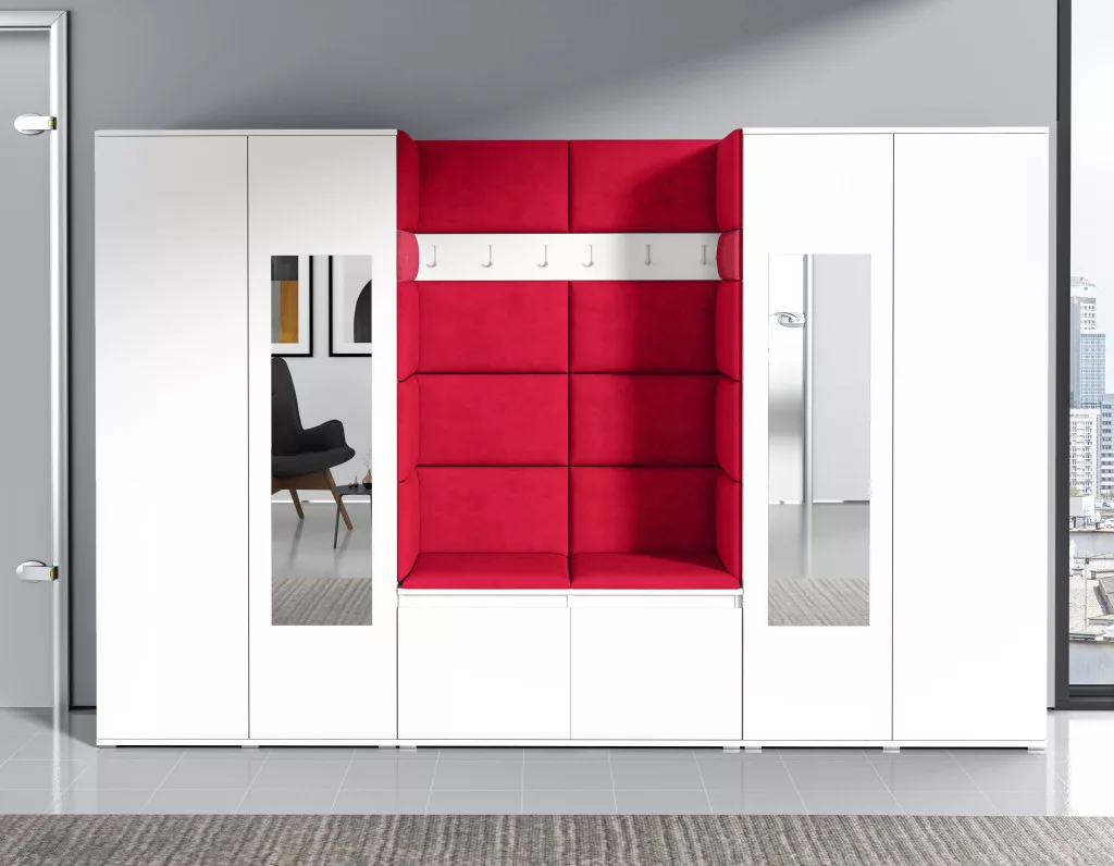 Blum 10 kárpitozott előszobafal tükörrel, fehér - piros 09 - egyedi