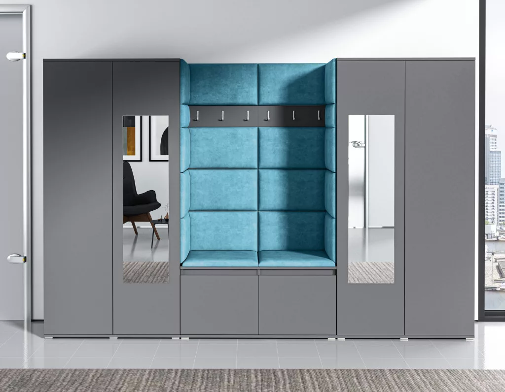 Blum 10 kárpitozott előszobafal tükörrel, grafit - azúr 13 - egyedi