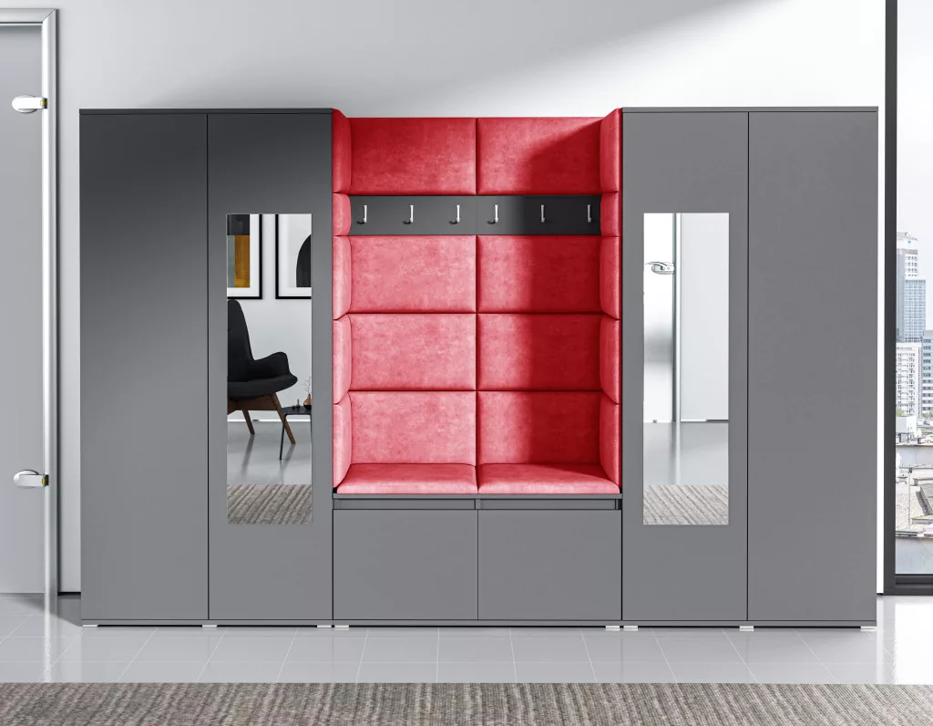 Blum 10 kárpitozott előszobafal tükörrel, grafit - piros 09 - egyedi