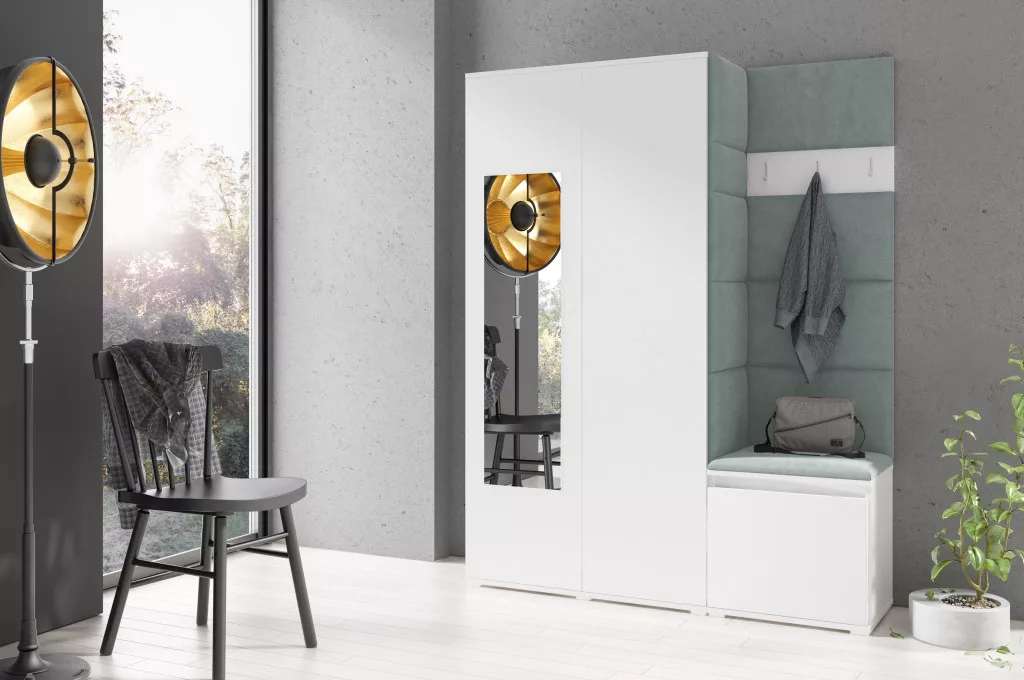 Blum 11 kárpitozott előszobafal tükörrel, fehér - menta 21 - egyedi